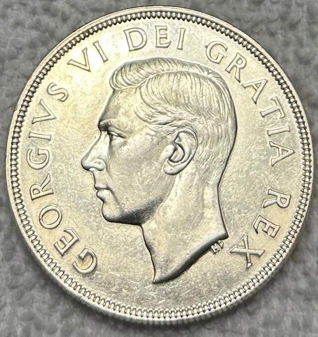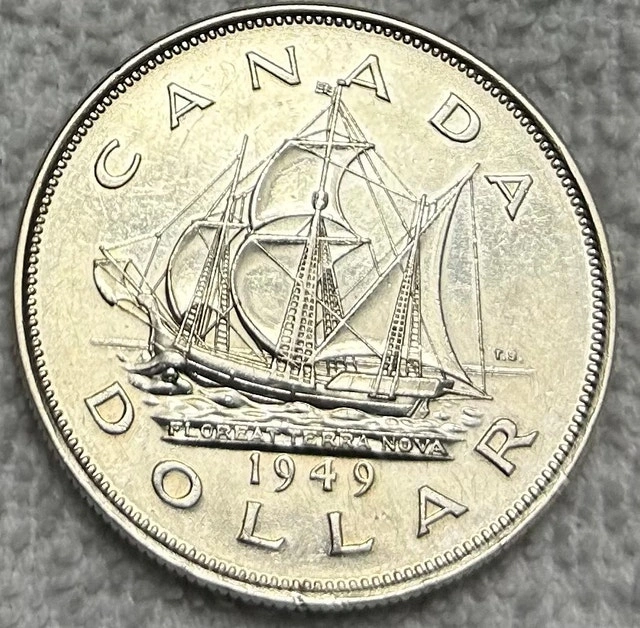 This is a 1949 Canadian silver dollar, a beautiful piece of history featuring the iconic sailing ship design on one side and King George VI on the other. It's a fantastic collectible for anyone interested in Canadian numismatics. The coin is in line with other graded examples maintaining a clear design and detail that makes it clearly that grade. Cash accepted, Cashless payment accepted.