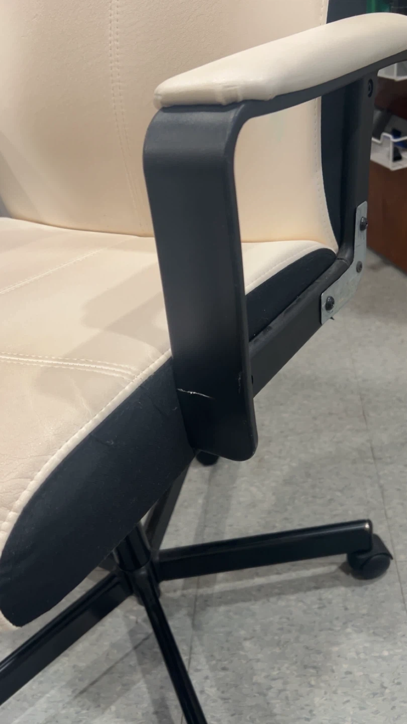 Selling for the Cheap price due to the scratch on the arm + some staining and spots on the white (faux) leather fabric.