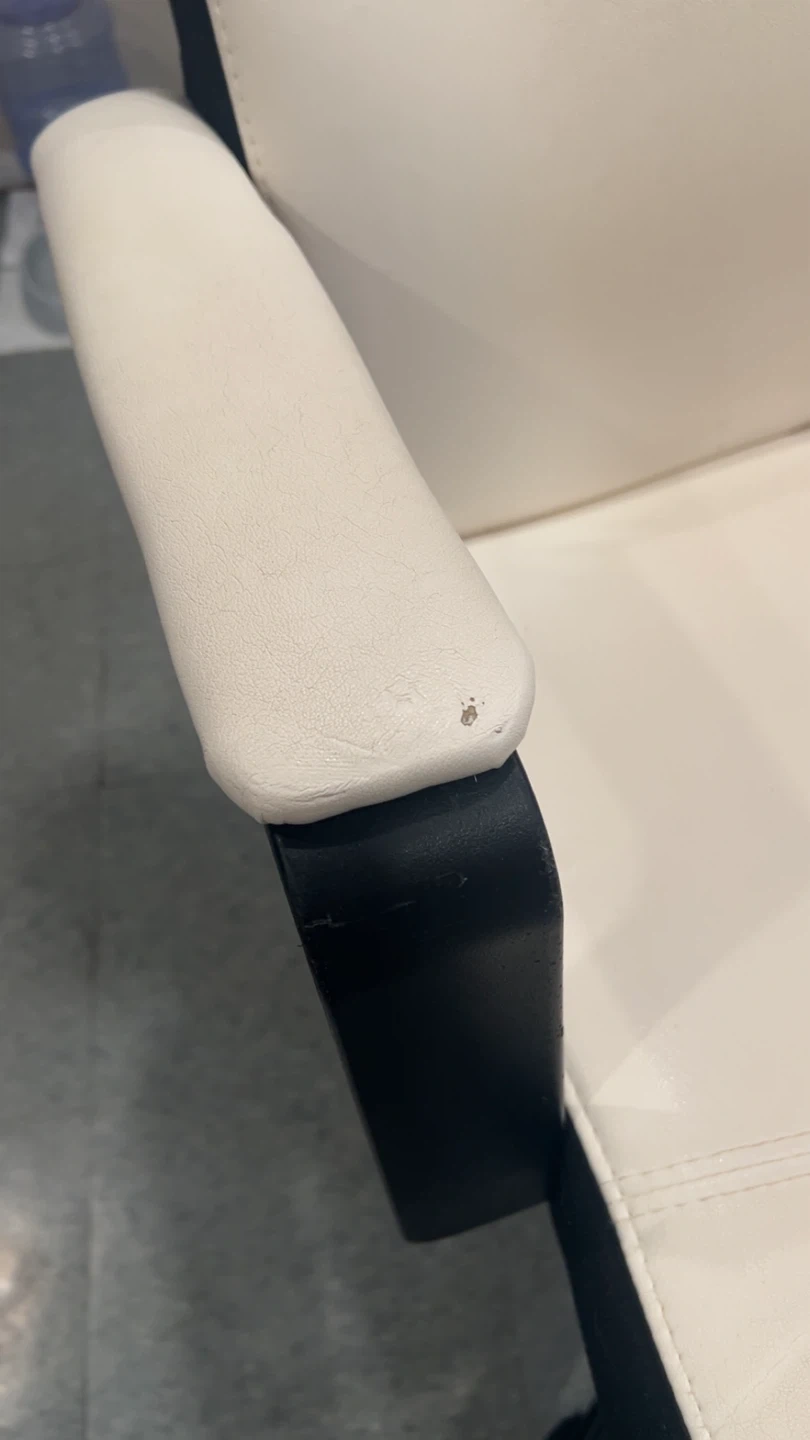 Selling for the Cheap price due to the scratch on the arm + some staining and spots on the white (faux) leather fabric.
