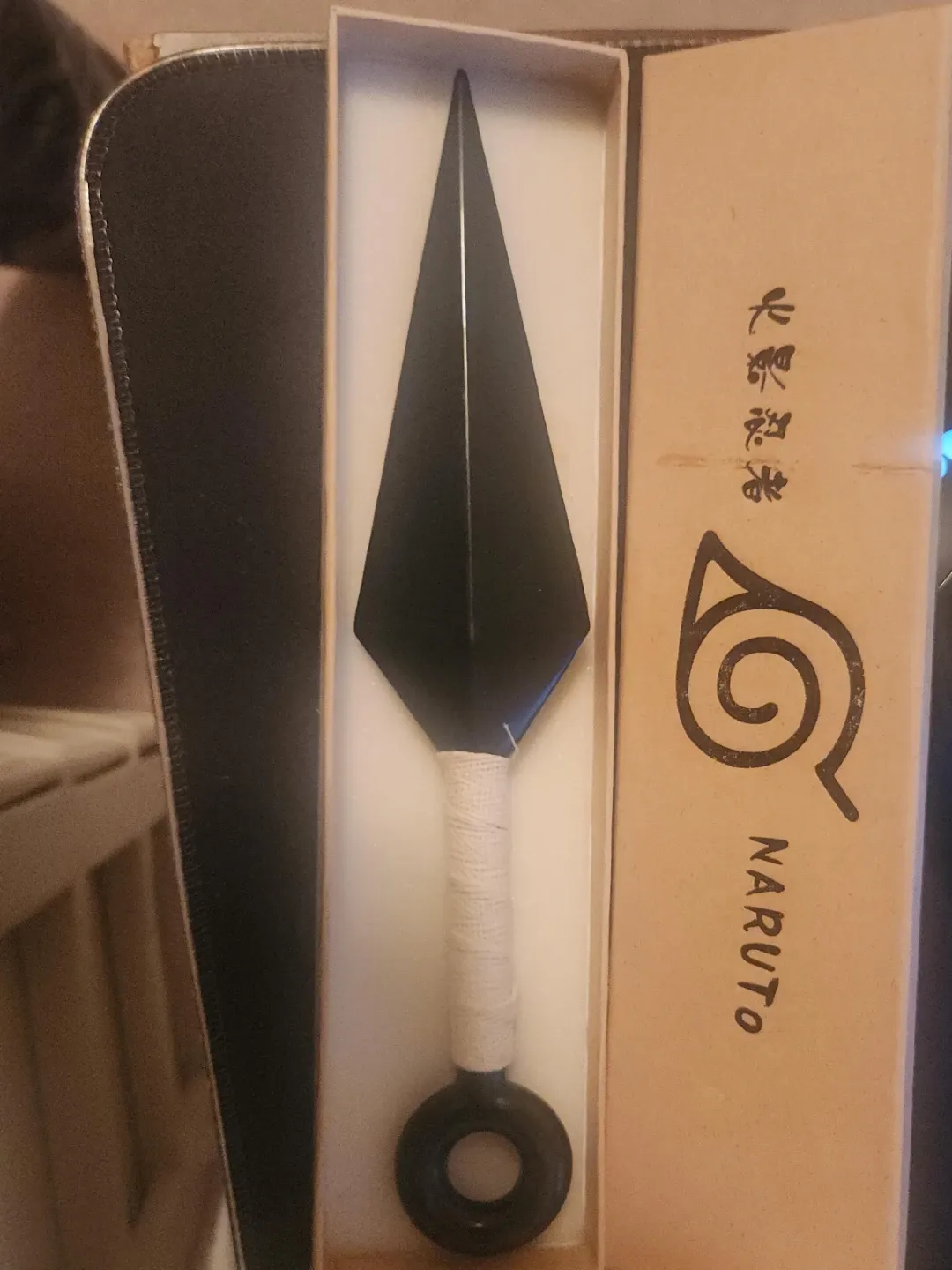 This is a replica kunai throwing knife from Naruto. It's black with a white wrapped handle and comes in its original box. It's a great display piece for fans of the anime!