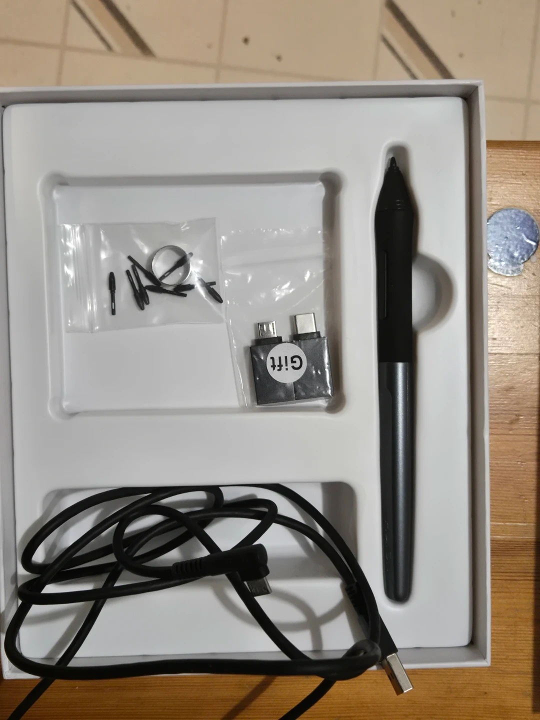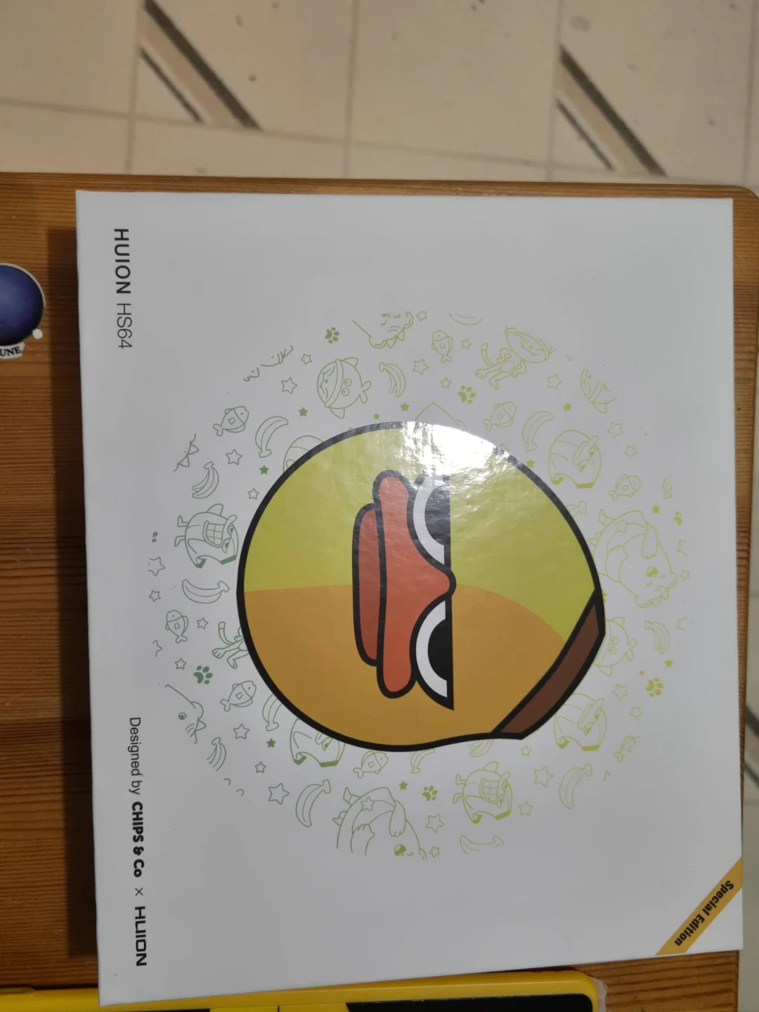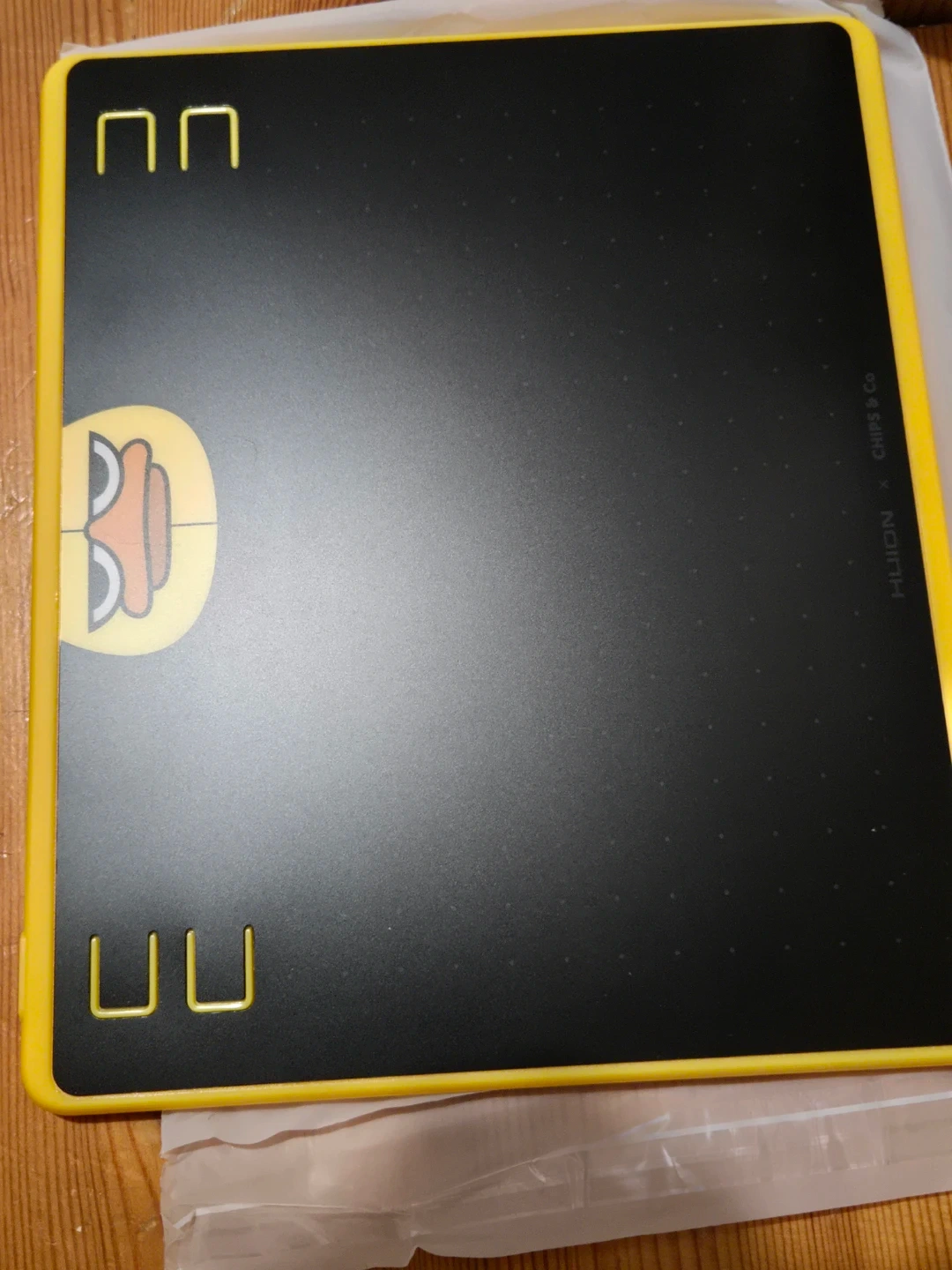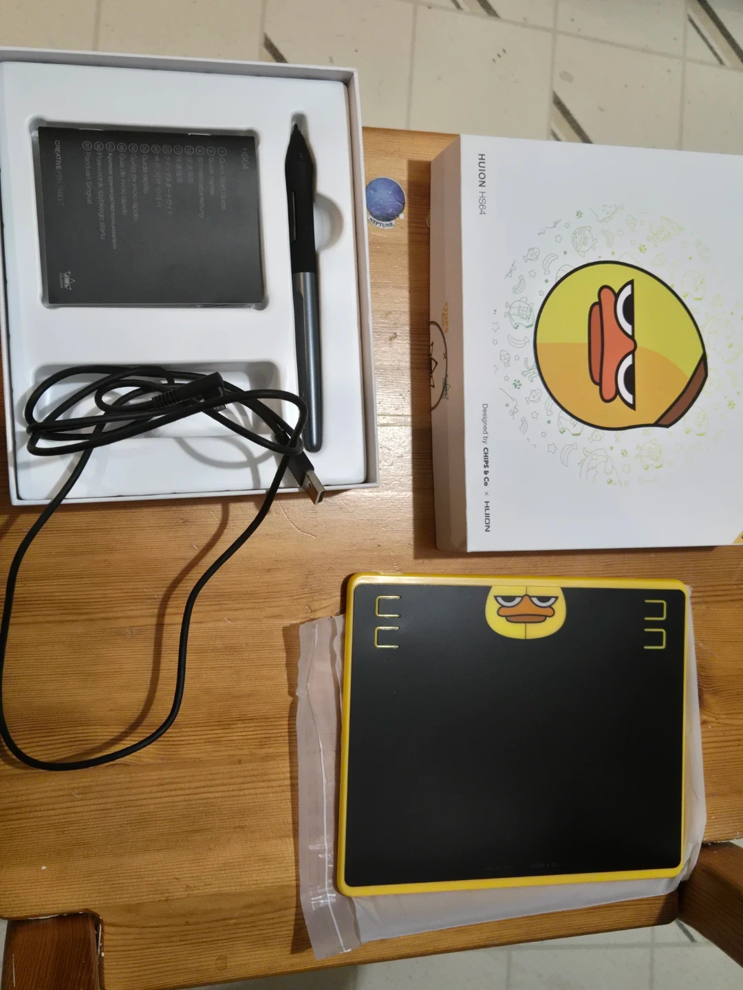 This is a HUION HS64 Special Edition graphics drawing tablet. It comes with a stylus, charging cable, and extra pen nibs. The tablet is black with a yellow border and features a cute duck design. It's great for digital artists and designers!