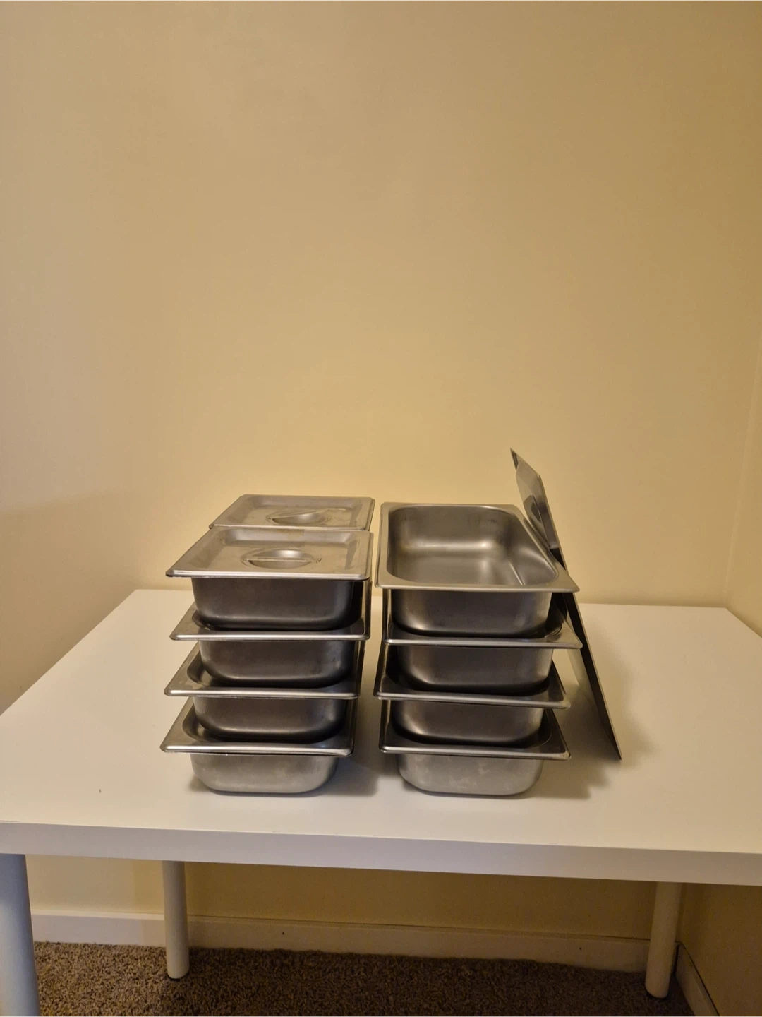 We are giving out set of 9 stainless steel food pans. Includes 7 third pans with lids (long rectangle ones) and 2 sixth pans with lids (square ones). These are standard hotel pans, perfect for catering or buffet use. There is little sign of wear but it is in mint condition.