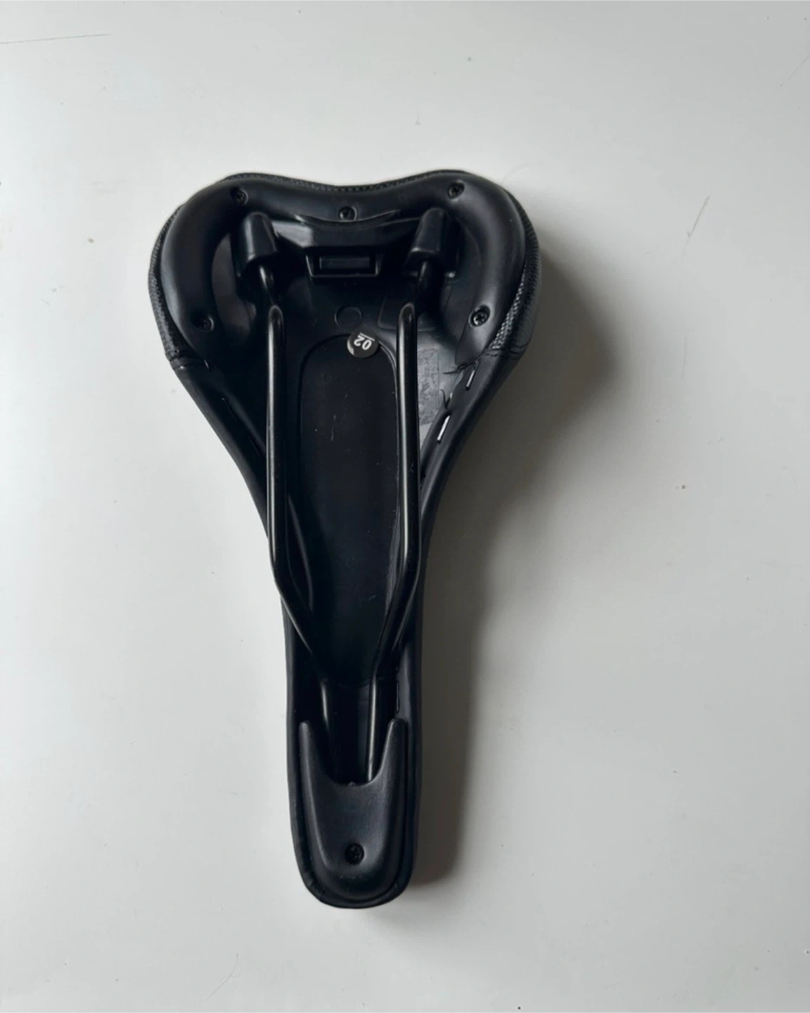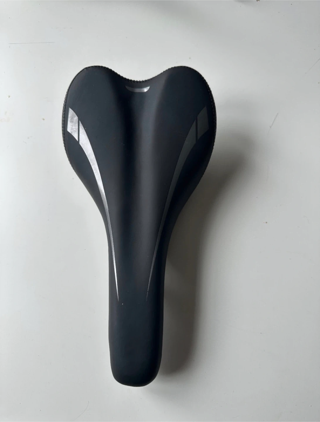 Black bicycle saddle with silver accents. It's made of durable material and features a comfortable shape for riding. Attaches to standard seat posts.