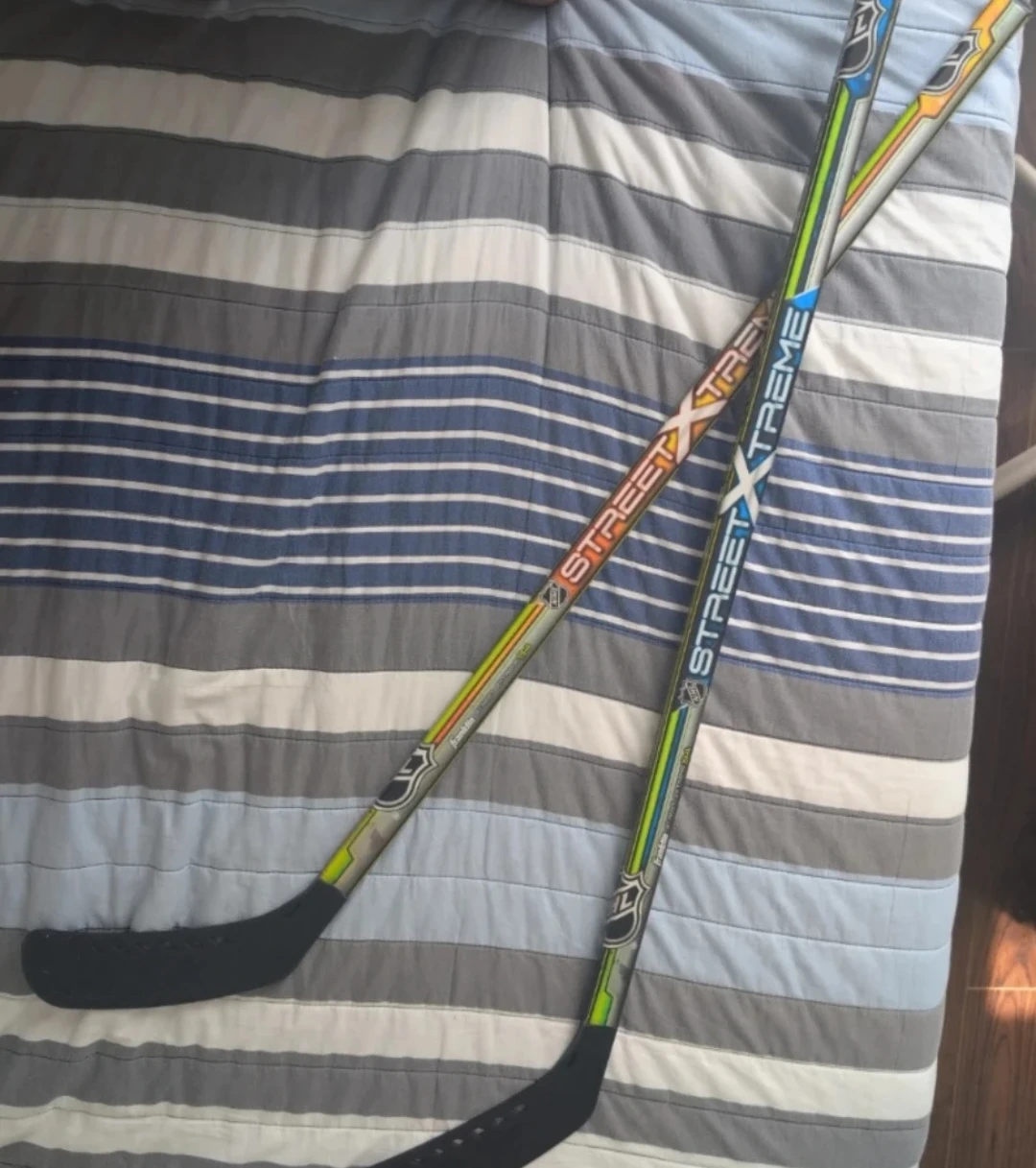 Two Franklin Street Xtreme hockey sticks for street play. These sticks have a plastic blade and a composite shaft. They're a great choice for practicing your puck handling skills on pavement or in the driveway.