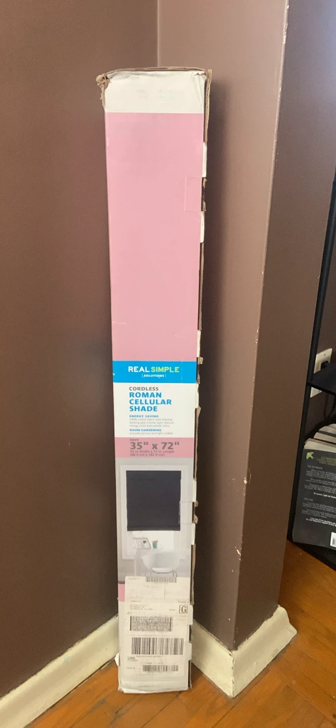 This is a new Real Simple cordless Roman cellular shade in navy. It's 35 inches wide by 72 inches long. The shade offers energy saving and room darkening capabilities.