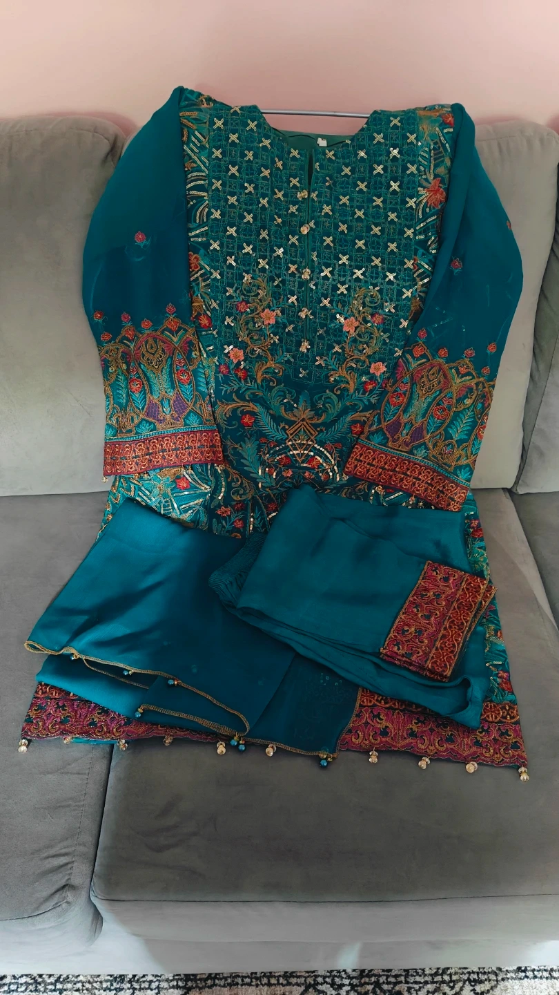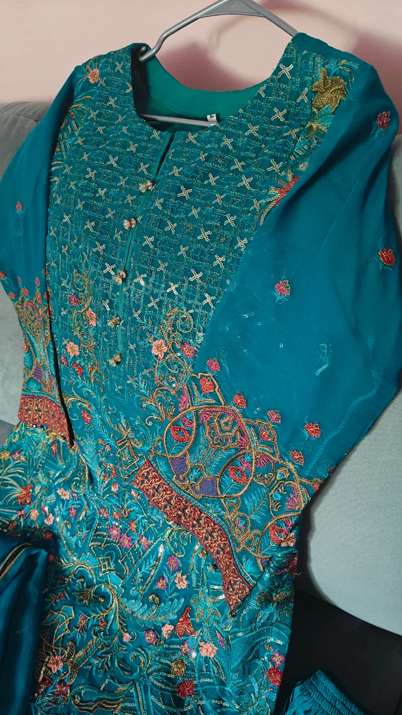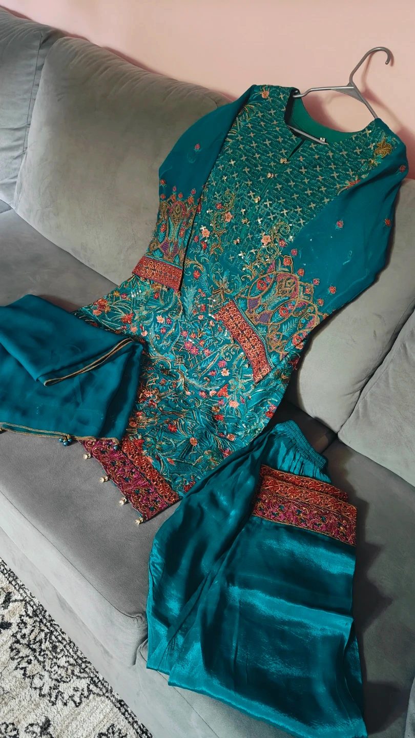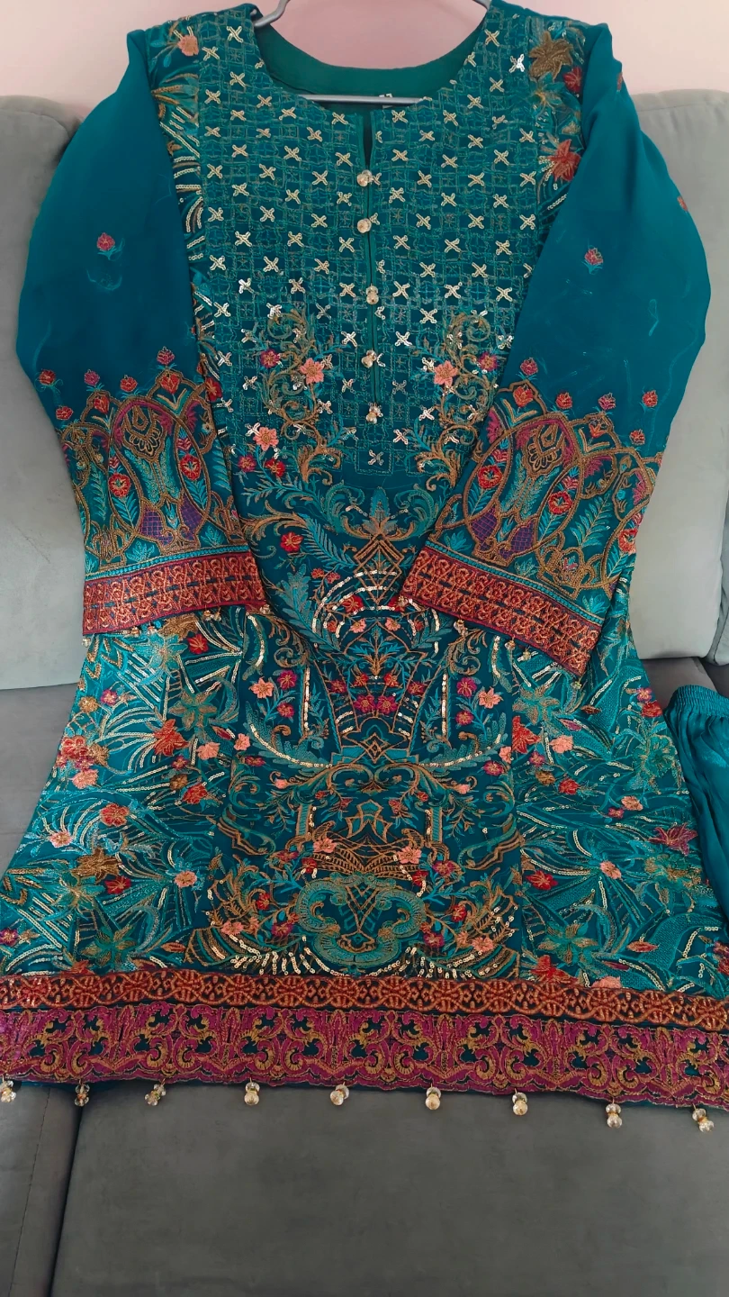 This is a beautiful teal kurti set with intricate embroidery all over. The set includes matching pants. It's perfect for special occasions or festive wear!