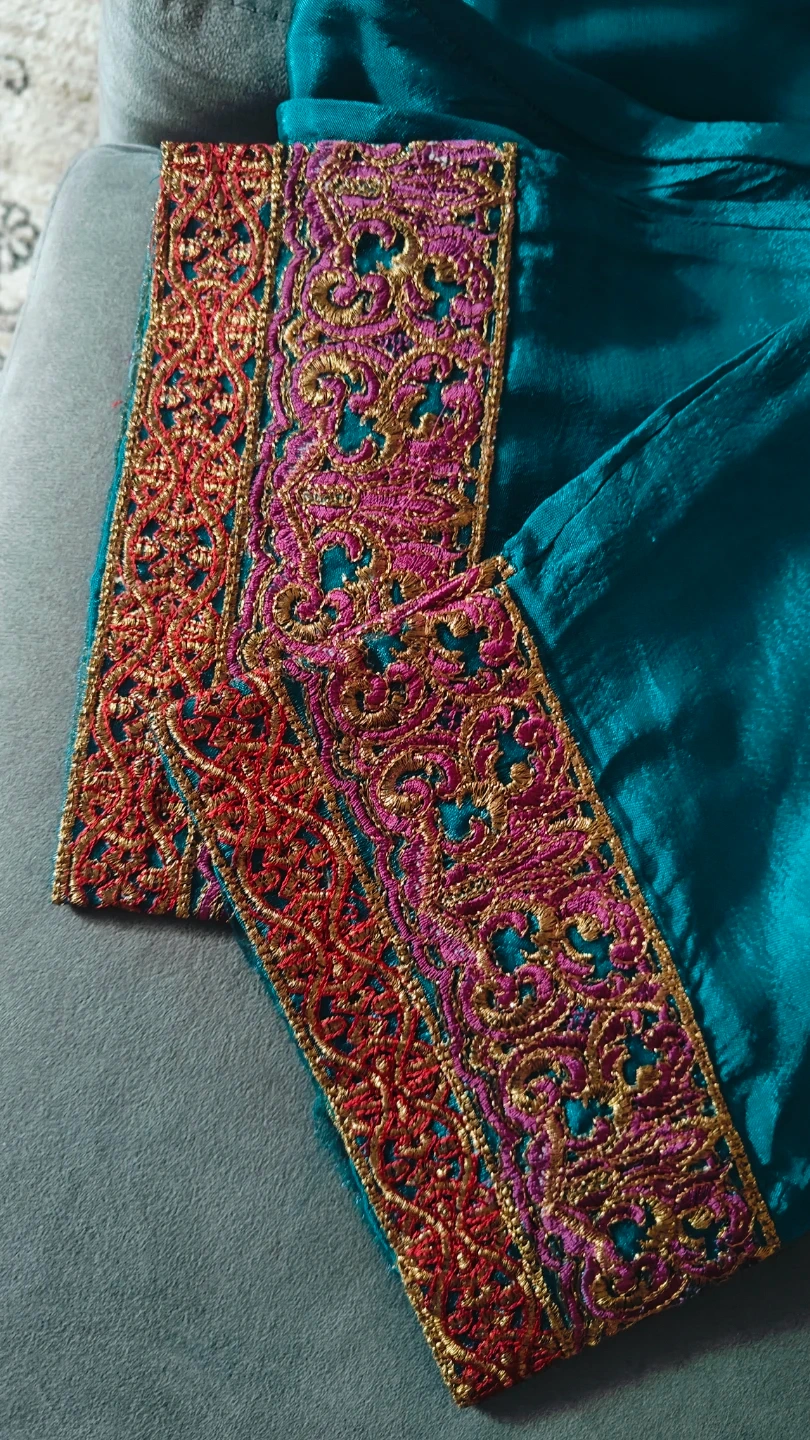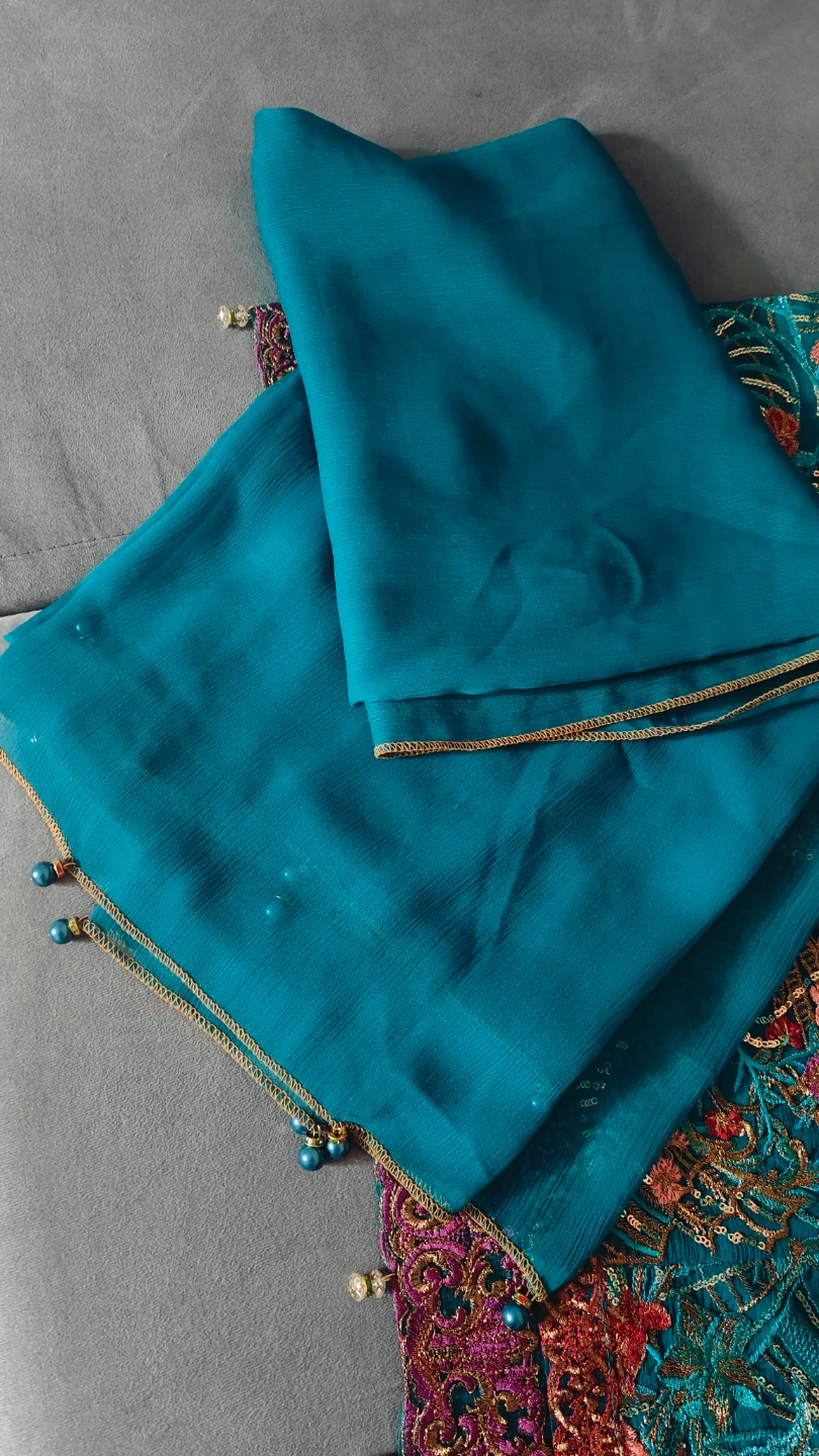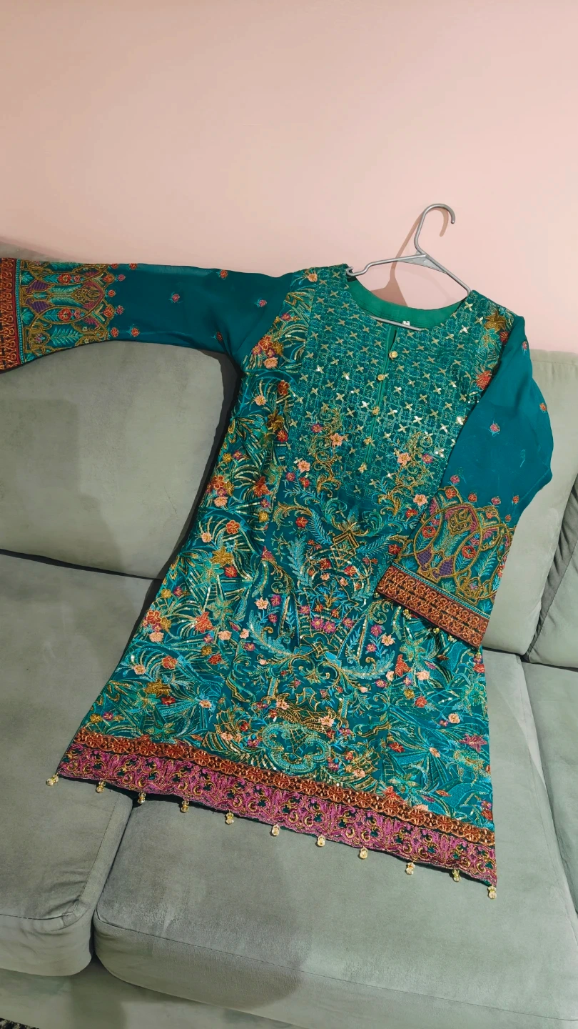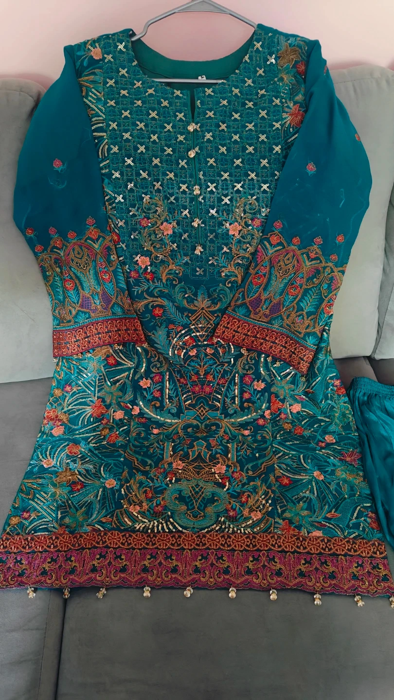 This is a beautiful teal kurti set with intricate embroidery all over. The set includes matching pants. It's perfect for special occasions or festive wear!