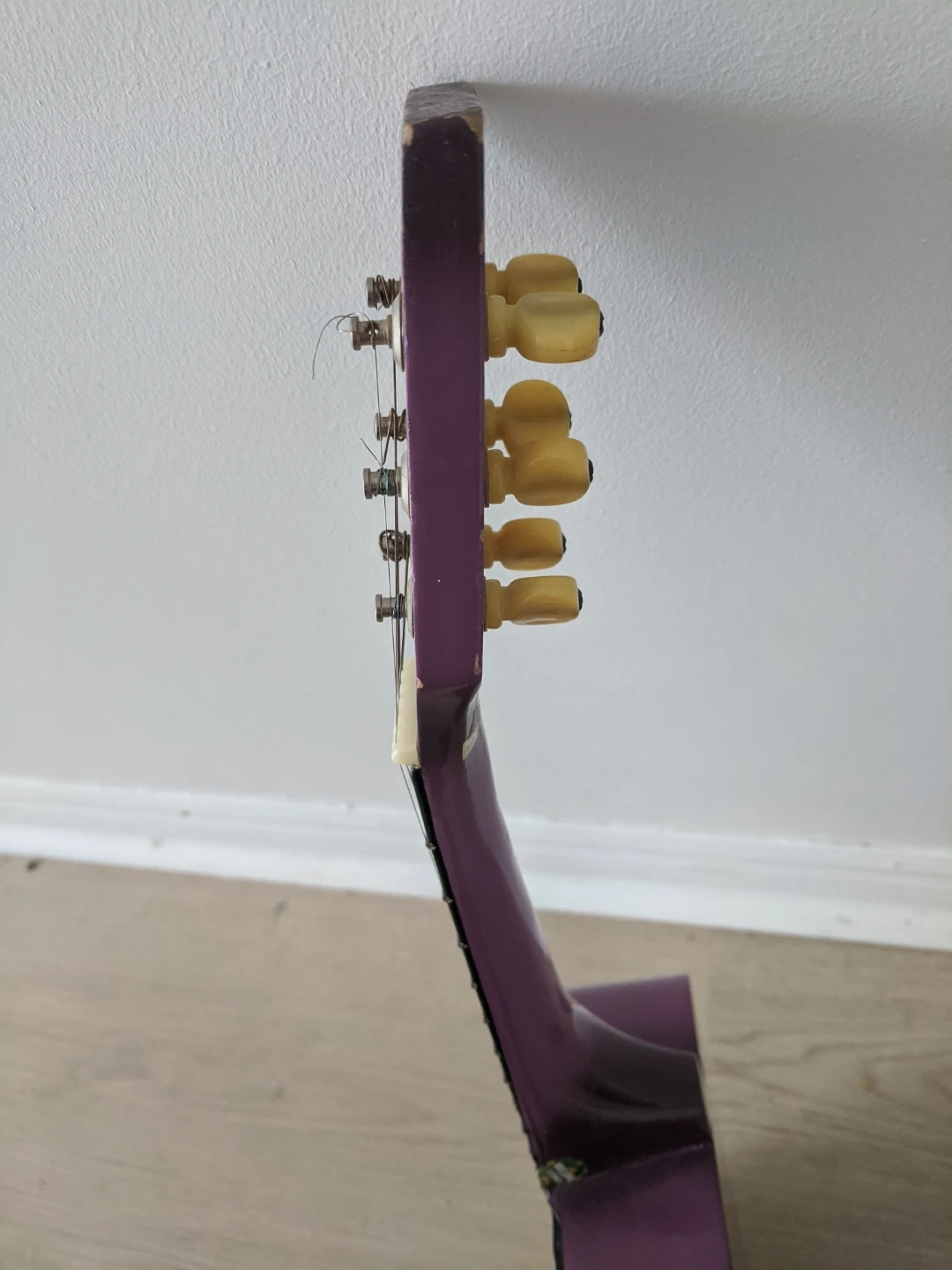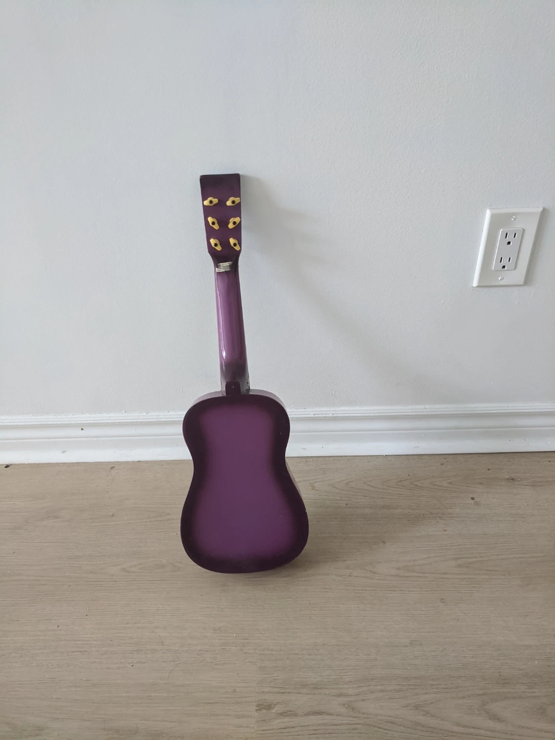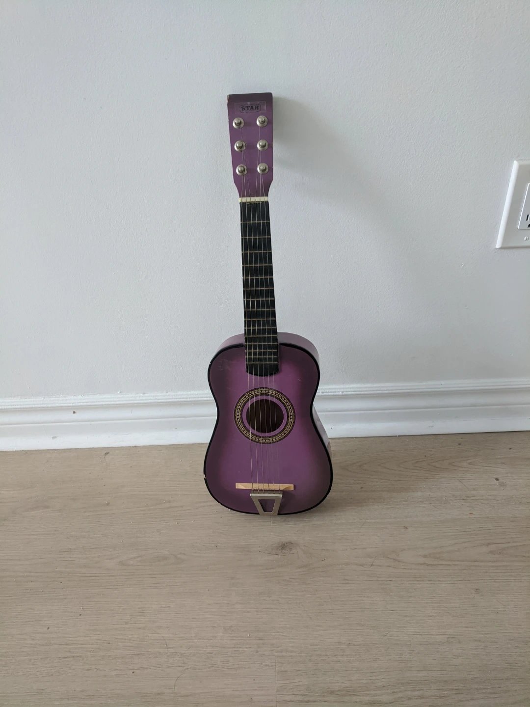 This is a purple STAR guitar. It's a fun size for kids to learn on! Has six strings and tuning pegs. Used but okay.