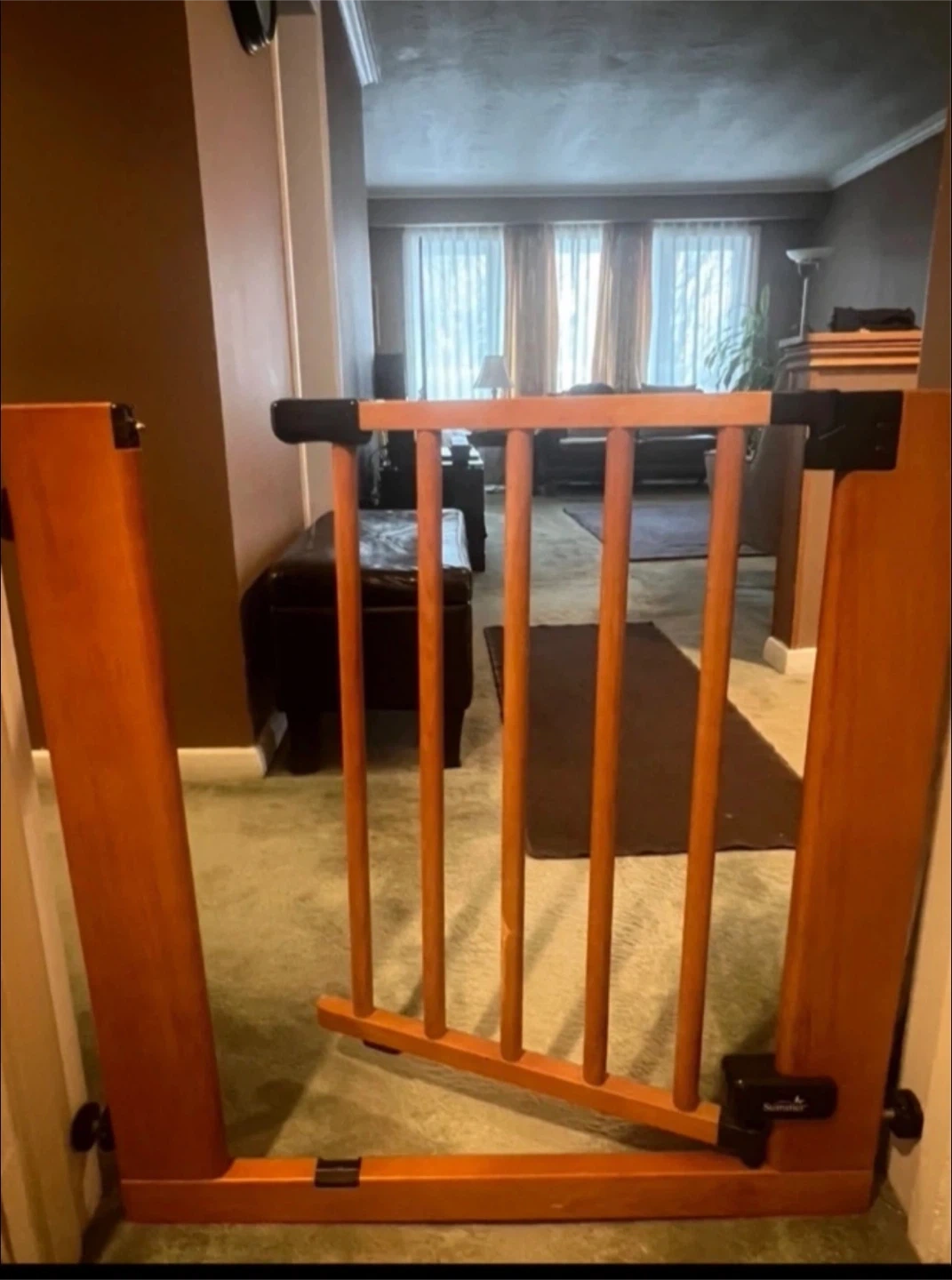 A wooden baby safety gate, perfect for keeping little ones safe. It's made of durable wood with black hardware. This gate is ideal for doorways or staircases to prevent accidents. Hardware is in great condition does not require any drilling , will not damage the door frame