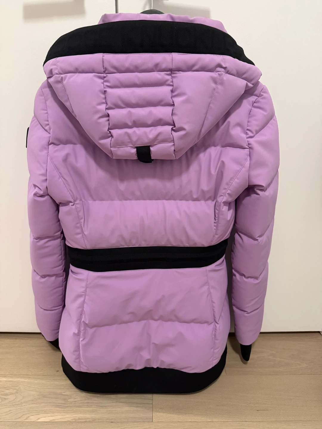 A stylish Moose Knuckles puffer jacket in a lovely lilac colour. It features a black banded waist and cuffs. This jacket is great for staying warm and looking fashionable during colder months. Bought it for $1400+ and only wore it 2 times