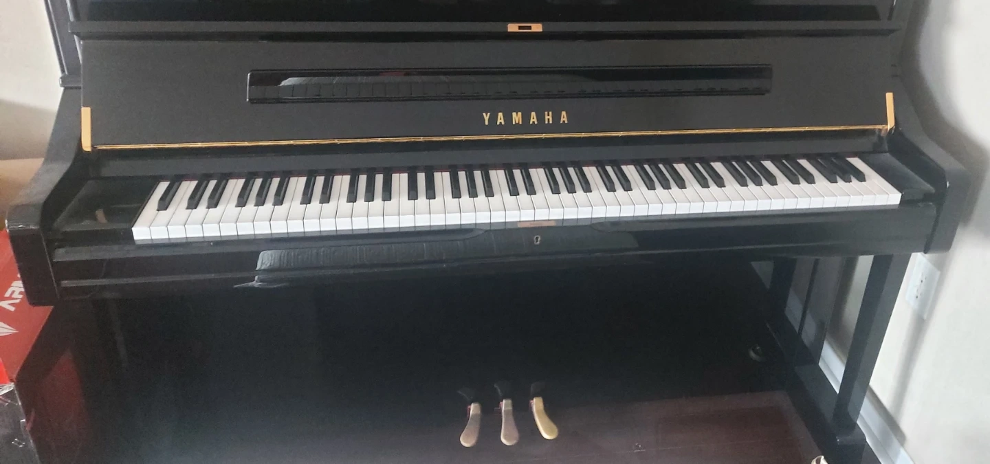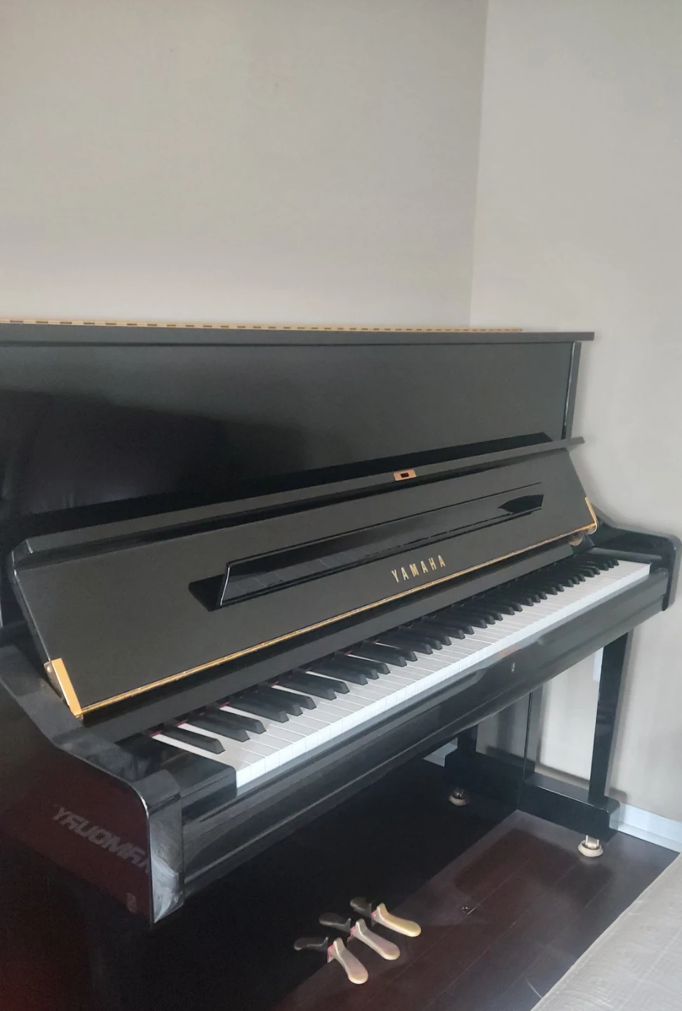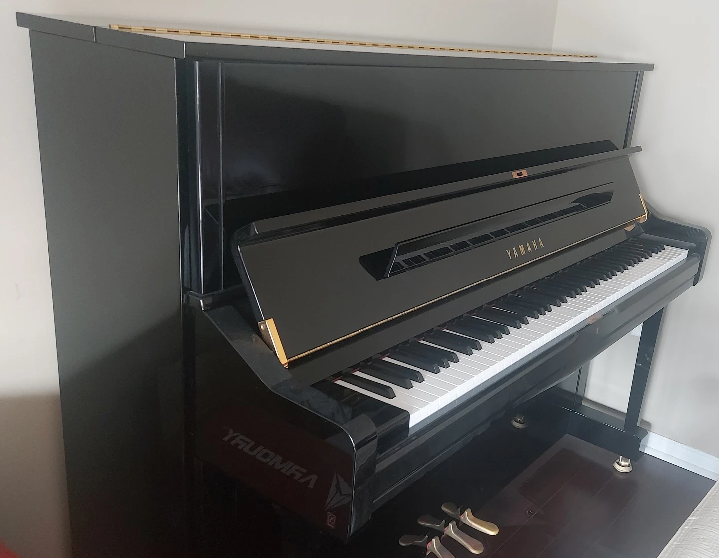 This is a Yamaha upright piano. It's black with gold accents. The certificate of authenticity included, serial number 6087970 from 2004. It offers stunning sound. Includes matching bench, one metronome, and dozens of piano books. Pickup in Oshawa.