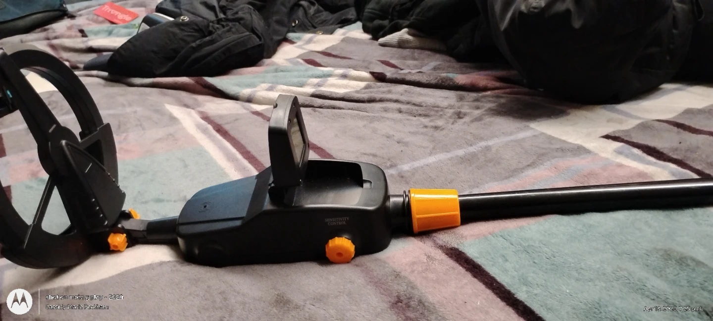 Black metal detector with orange accents. It has a sensitivity control dial. This detector is great for hobbyists looking for treasures.the only thing is the back plate that holds the battery in is missing. But it's brand new used if once and just never have time to get out too use it. It's a great deal so come on and get it.....