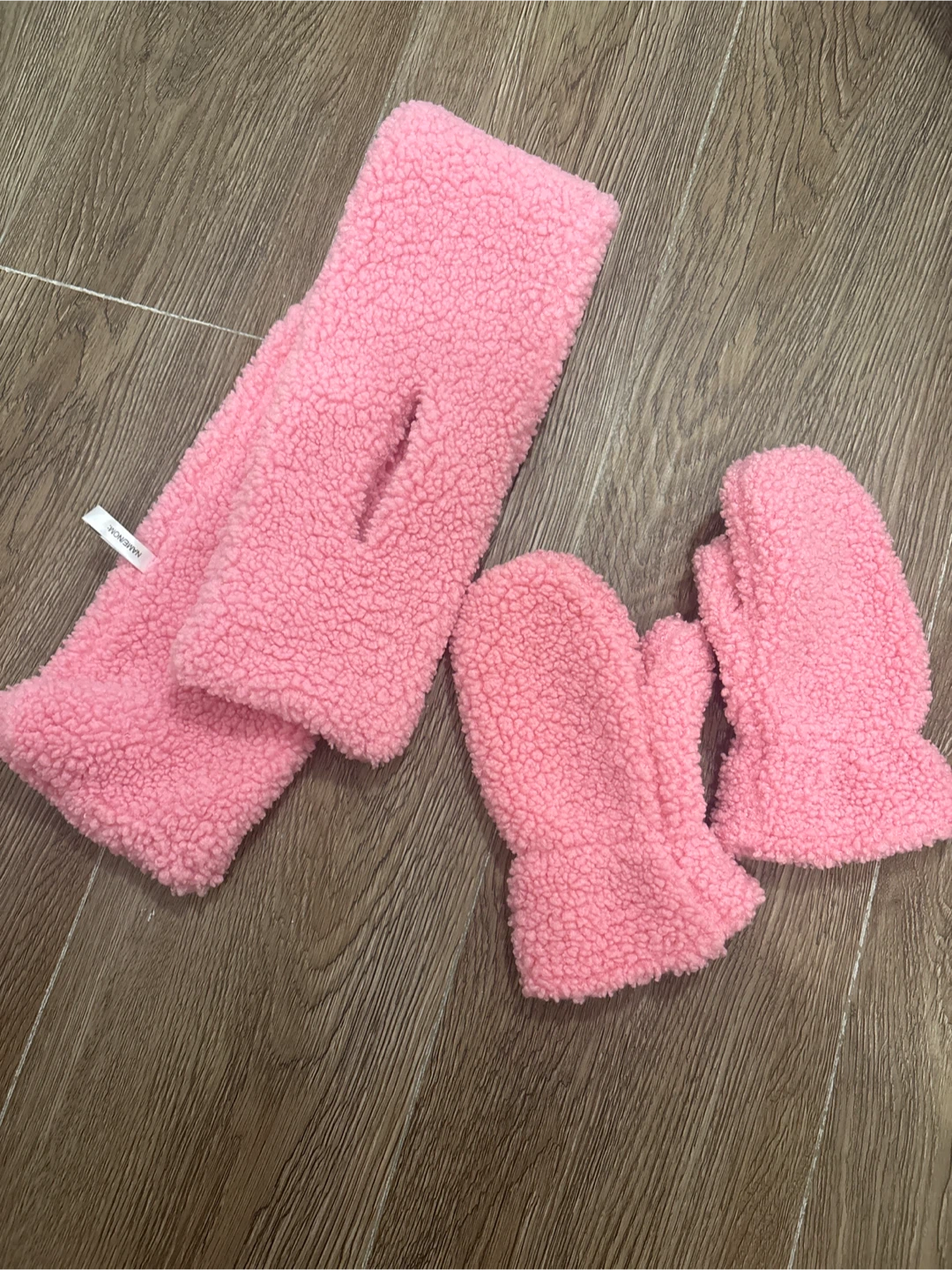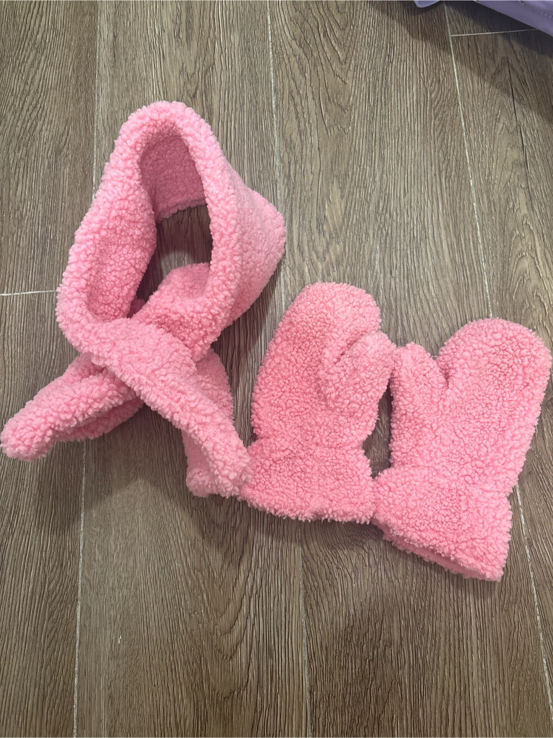 This cozy set includes a soft pink fleece scarf and matching mittens. The scarf has a slit for easy fastening. It's made from plush material for extra warmth. Perfect for chilly days!