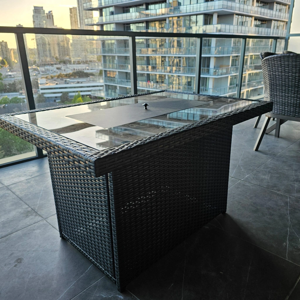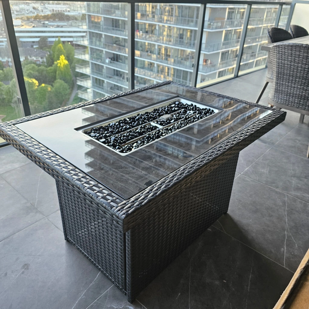 Enhance your outdoor setting with this elegant fire pit table, crafted with handwoven flat PE wicker and a durable powder-coated frame. It features a tempered glass top for a clean look and easy upkeep, plus fire glass for a beautiful flame effect.