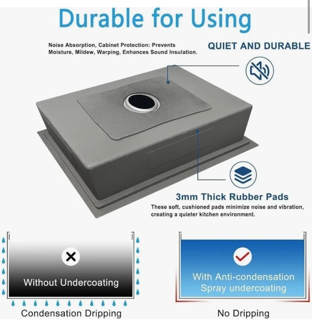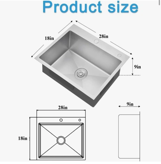 Stainless Steel Kitchen Sink Dimensions: Overall – 28” L x 18” W x 9” D. Gently rounded corners maximize the workspace in the sink bowl, engineered for complete drainage with a gently sloped bottom that prevents standing water. The optimized angle keeps glassware from falling when placed in the sink. Deep Single Bowl Kitchen Sink: 9 inch deep sink design allows you to accommodate stack of dishes, pans and pots, covering up dirty dishes before washing them all. Unbreakable Construction Kitchen Sink: Made of premium T304 stainless steel with a brushed finish to ensure scratch and stain resistance, the Stainless Steel Kitchen Sink is sturdy and durable, and will not fade over time. Featuring a commercial-grade satin finish that is dent and scratch resistant, it is not only easy to clean, but also highly durable. Sound Barrier Technology: The sound-proof pad have been added to the bottom of all our stainless steel Kitchen Sinks to reduce the sound of running water. An undercoating condensation layer minimizes noise and reduces condensation to protect your cabinet. X-Water Guideline: Water drains easily to avoid clogging. Topmount Convenience: Our sink seamlessly integrates with any countertop material for versatile styling. Designed for easy installation and removal without surface damage. Includes a sink drain pipe and filter for optimal drainage efficiency.