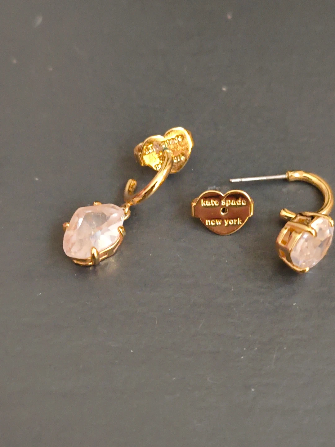 These stylish Kate Spade New York hoop earrings feature gold-tone metal with sparkling crystal accents. They're perfect for adding a touch of elegance to any outfit. Each earring showcases a dangling gemstone design.