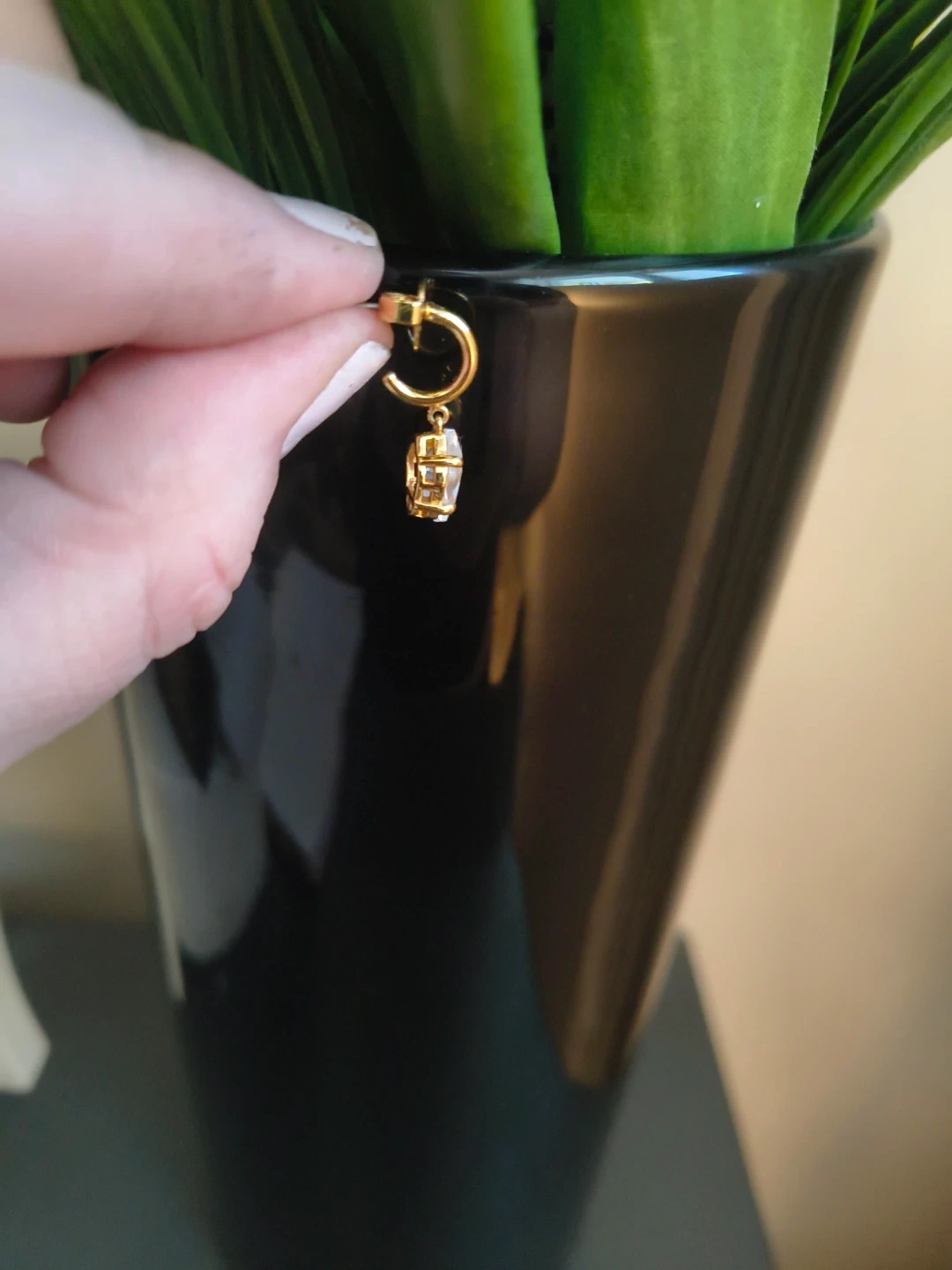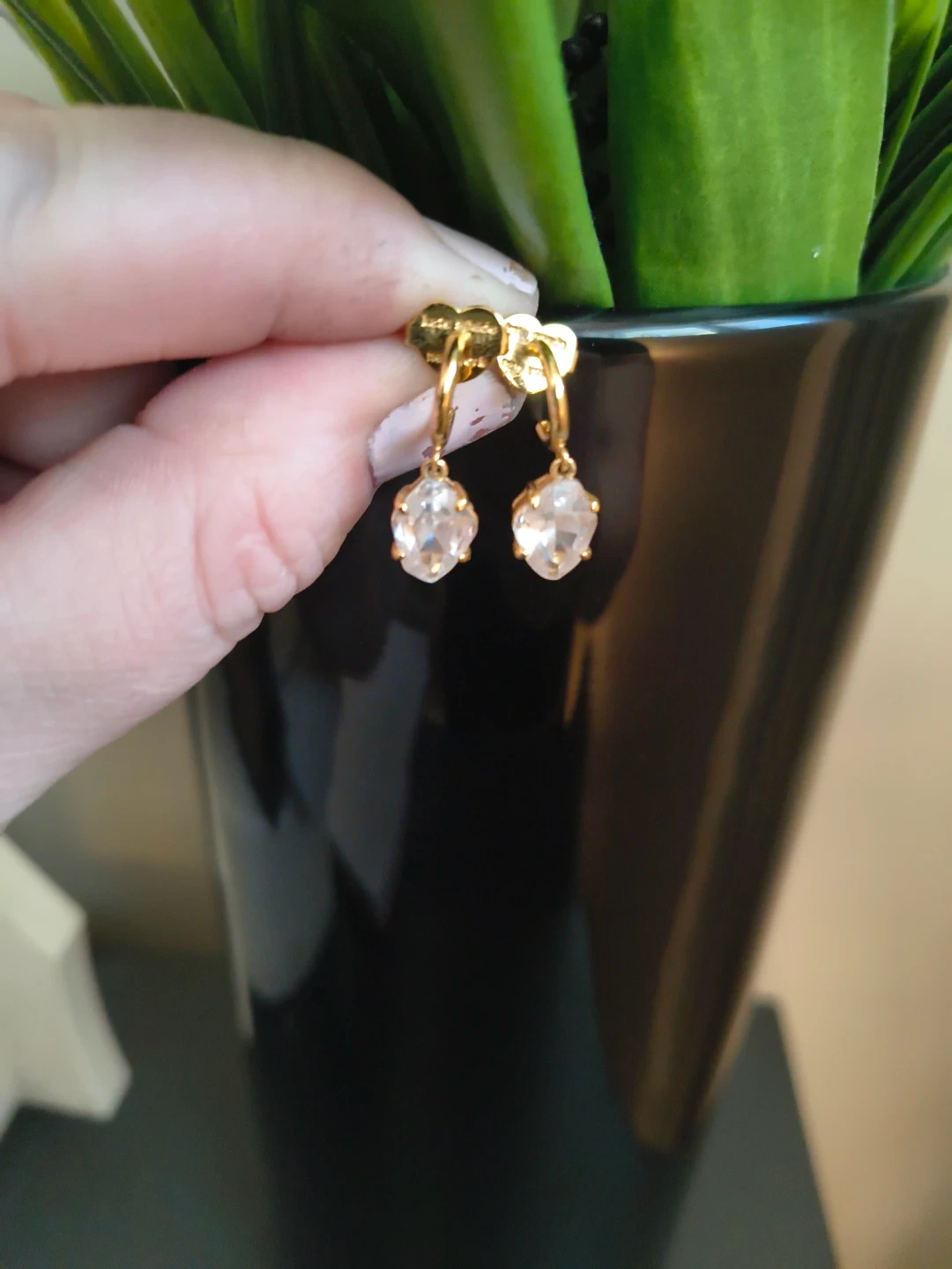 These stylish Kate Spade New York hoop earrings feature gold-tone metal with sparkling crystal accents. They're perfect for adding a touch of elegance to any outfit. Each earring showcases a dangling gemstone design.