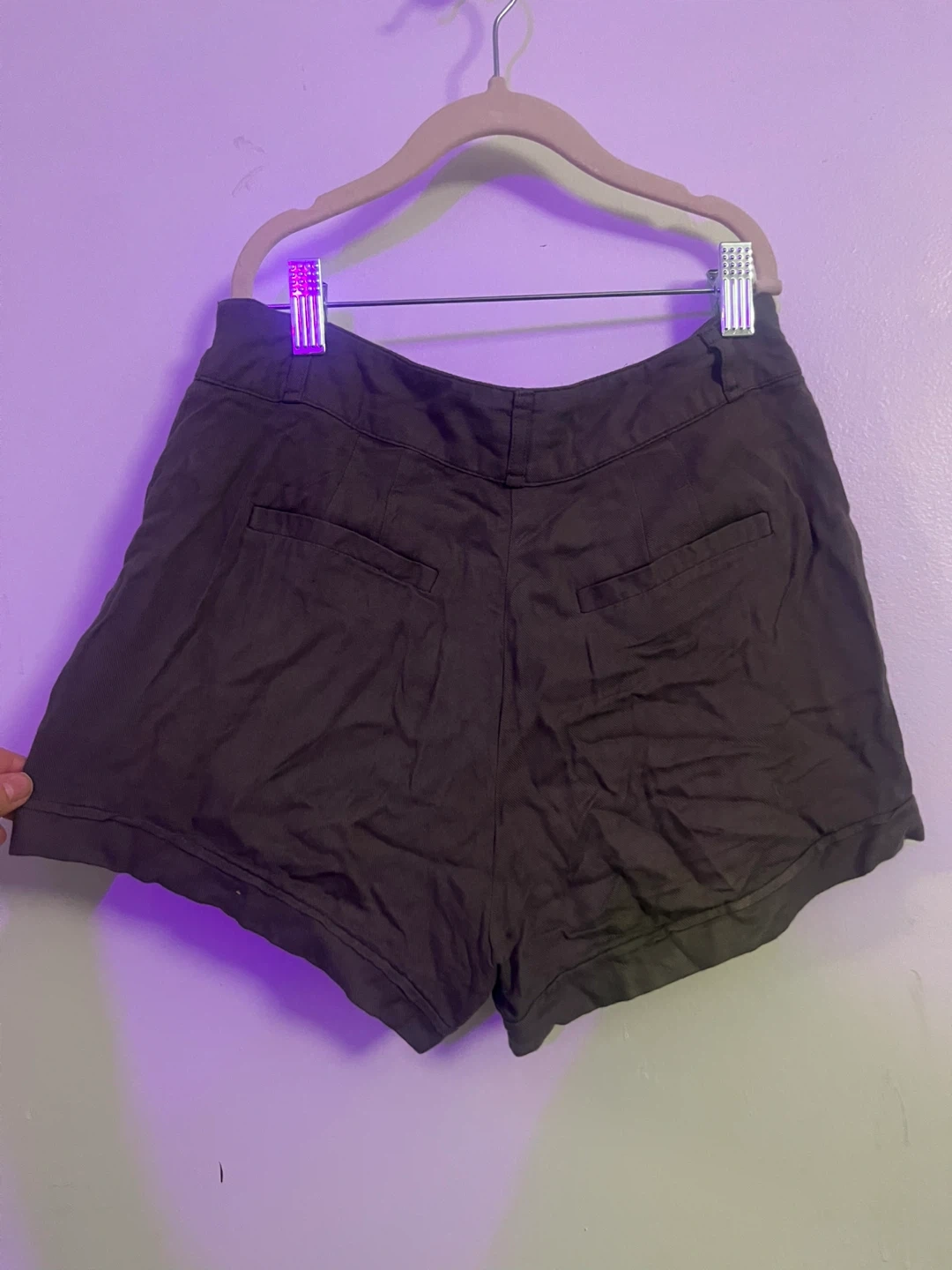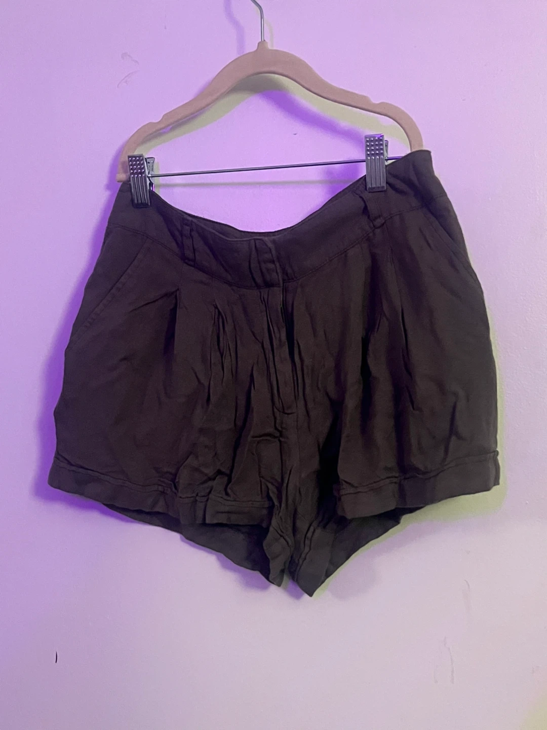These dark olive green shorts feature a pleated front and a high-waisted fit. They have a zip fly with button closure and pockets at the front and back. Made from a lightweight fabric.