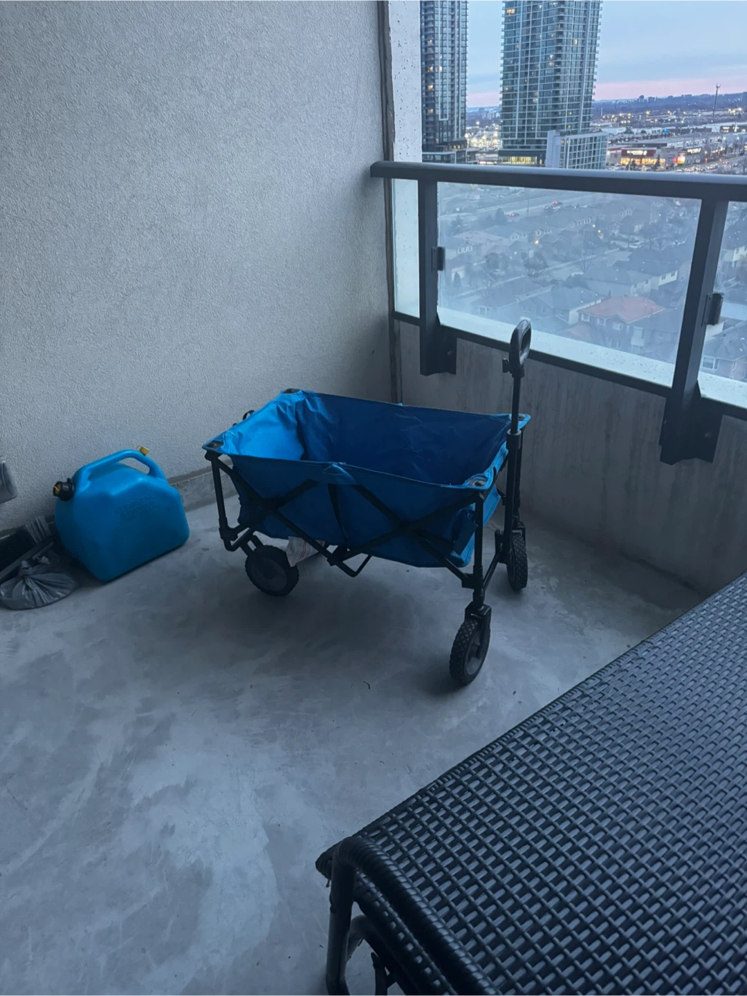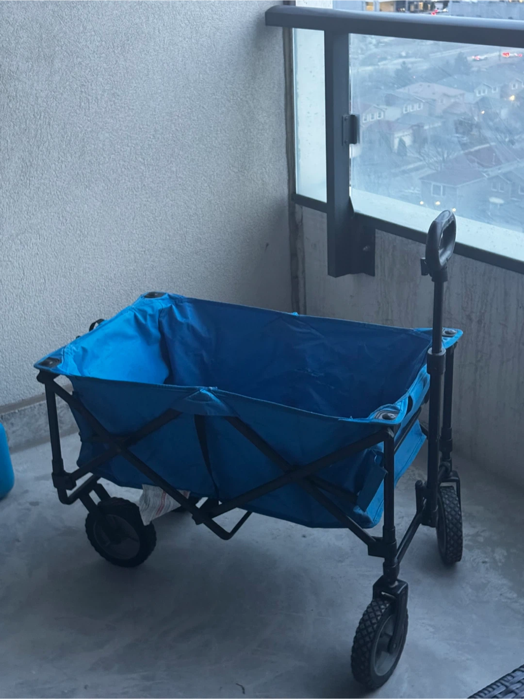 Large Durable blue utility wagon has folding black metal frame and adjustable pull handle. Fabric is heavy-duty polyester with four plastic wheels for easy transport. Wagon is collapsible for storage.