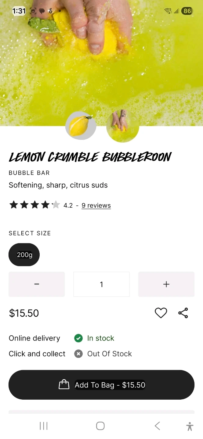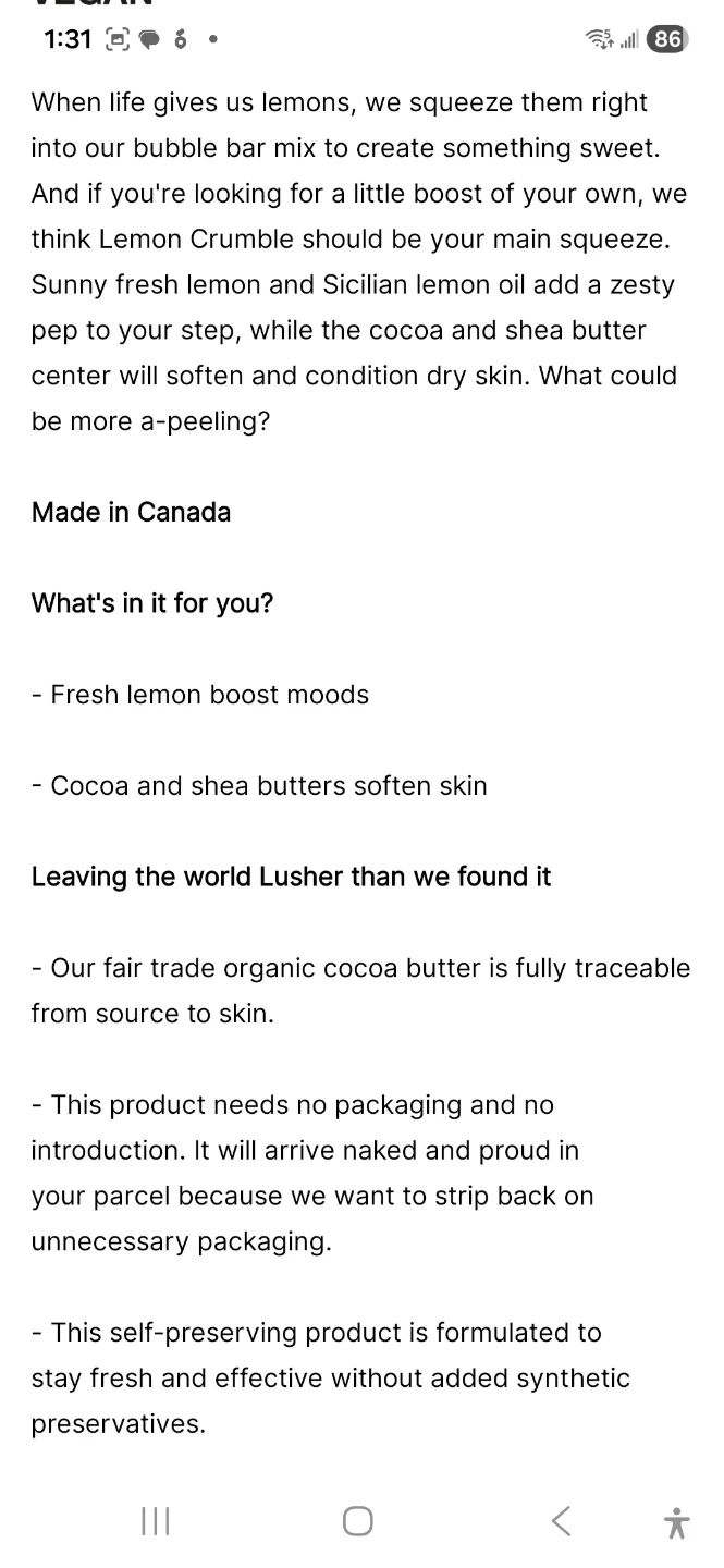 Looking for a little boost? This Lush Lemon Crumble Bubbleroon is perfect for softening your skin with cocoa and shea butters! It's made in Canada and features fresh lemon to boost your mood. This bubble bar needs no packaging, arriving naked and proud in your parcel, helping to strip back on unnecessary packaging. Select size is 200g and originally bought for $15.50!