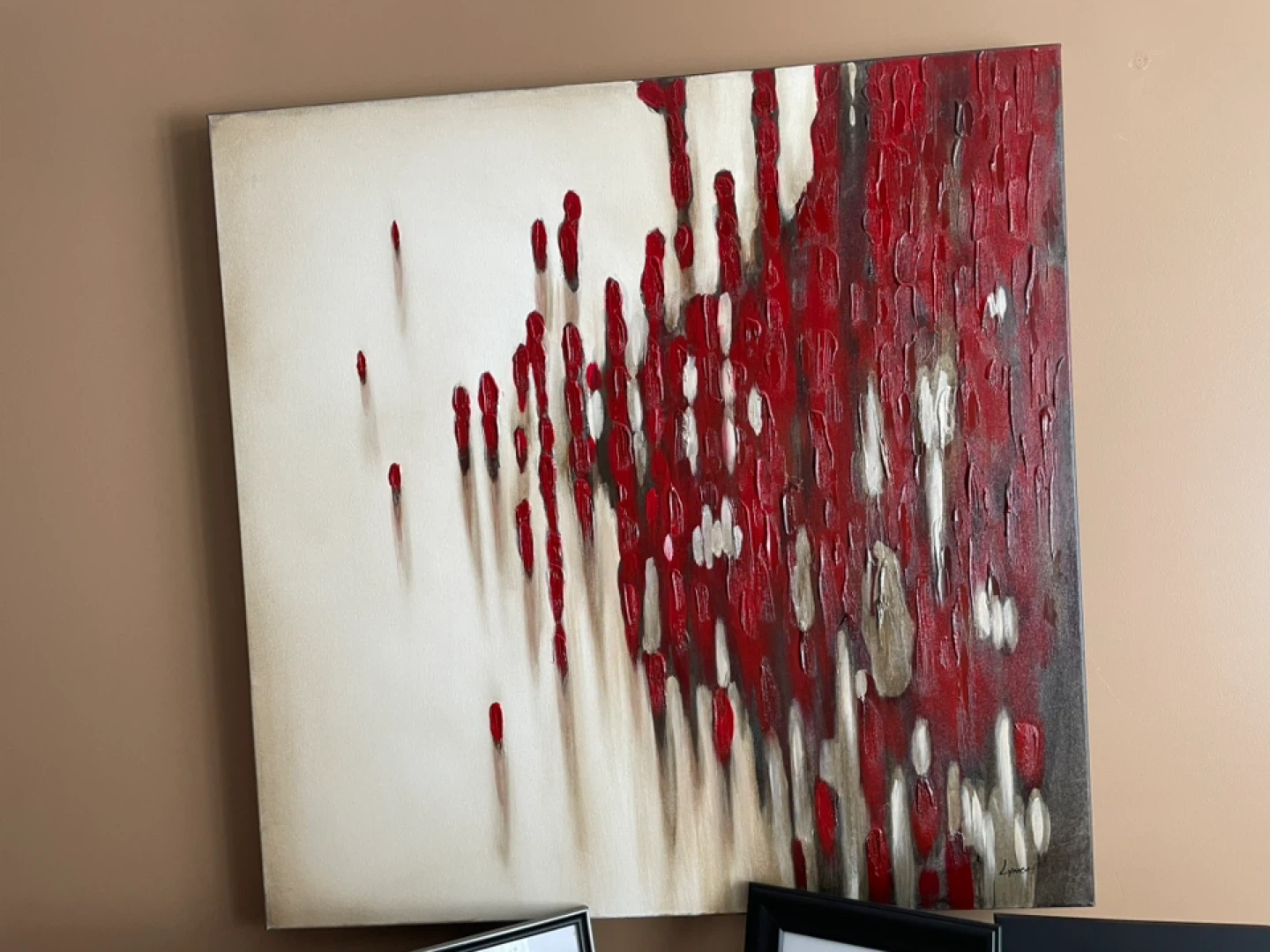 This is a textured abstract canvas painting with bold red strokes and subtle beige tones. It's a striking piece that would add a modern touch to any room. Approximate size: 40 x 40 inches. Pet free smoke free home.