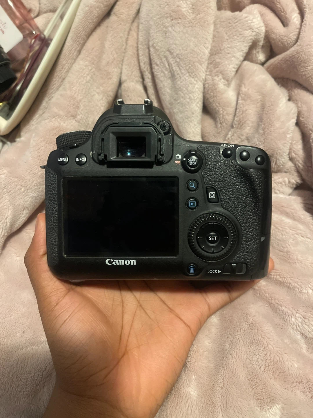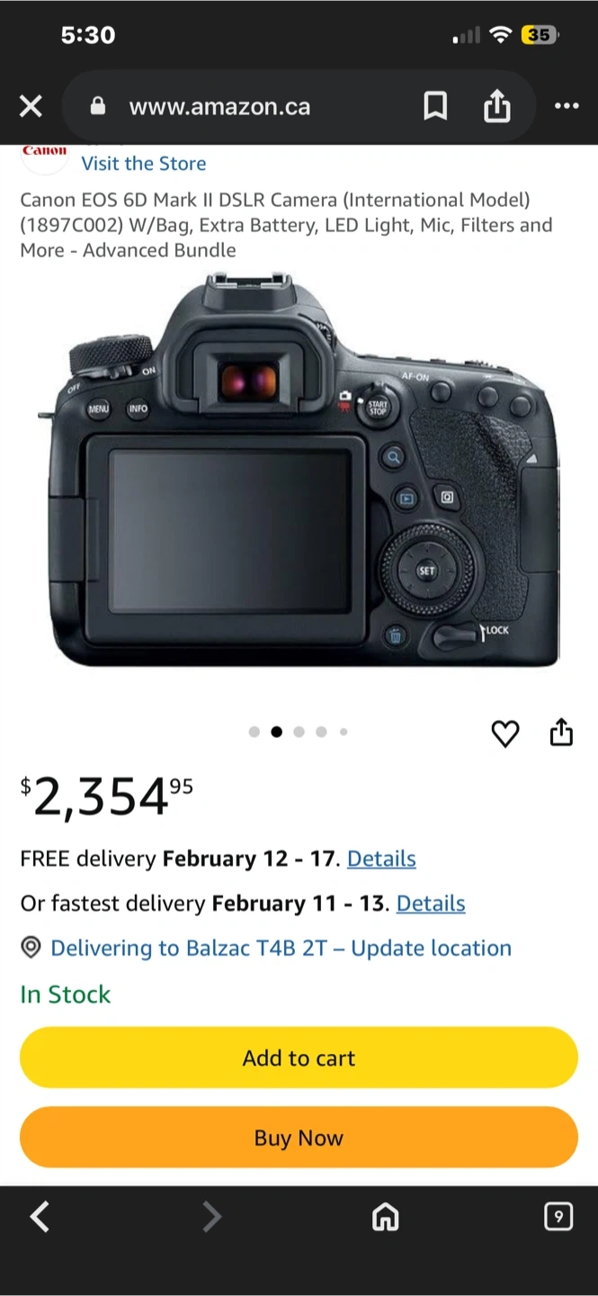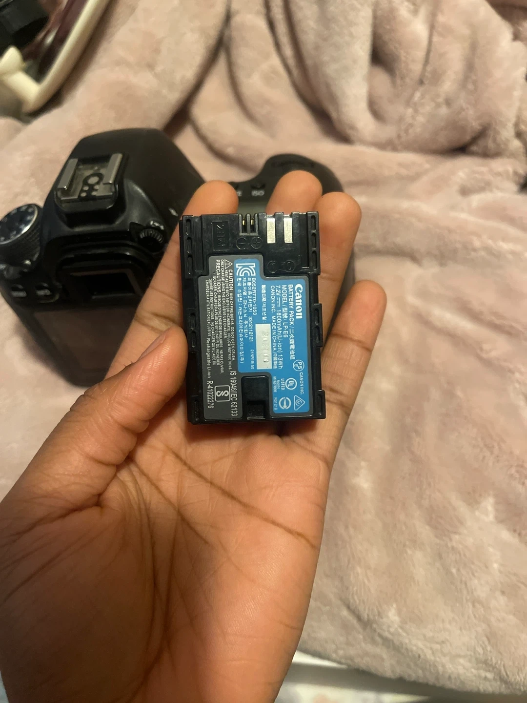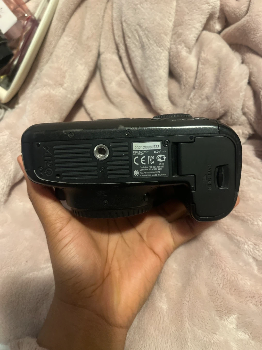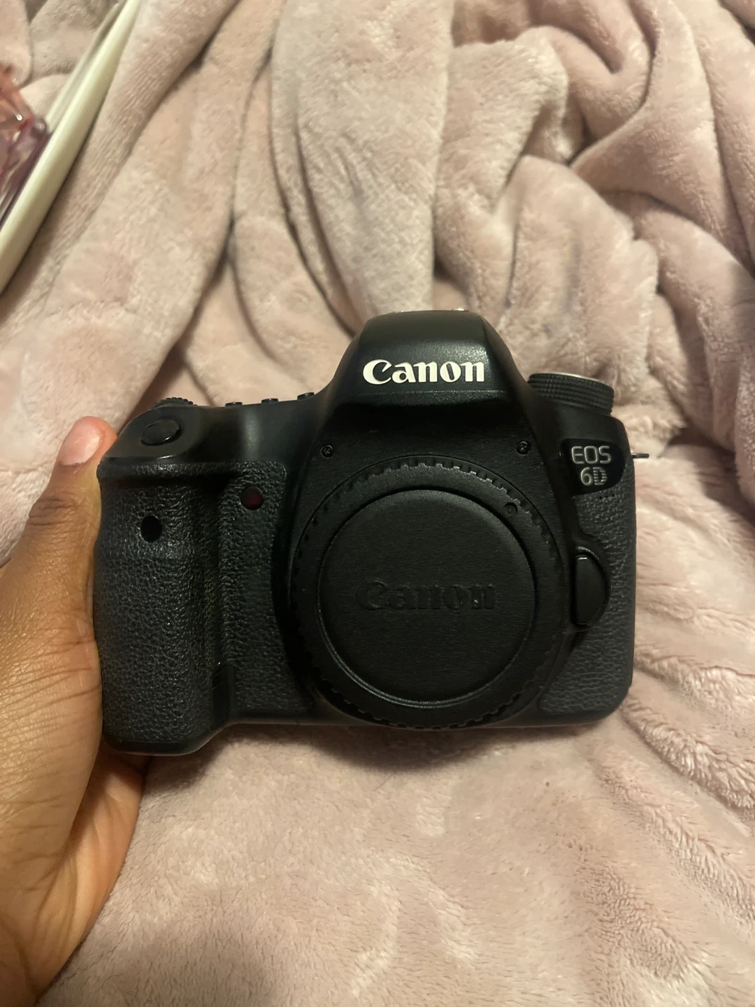 Canon EOS 6D DSLR camera. Black colour. Made in Japan. It's a full-frame digital camera.