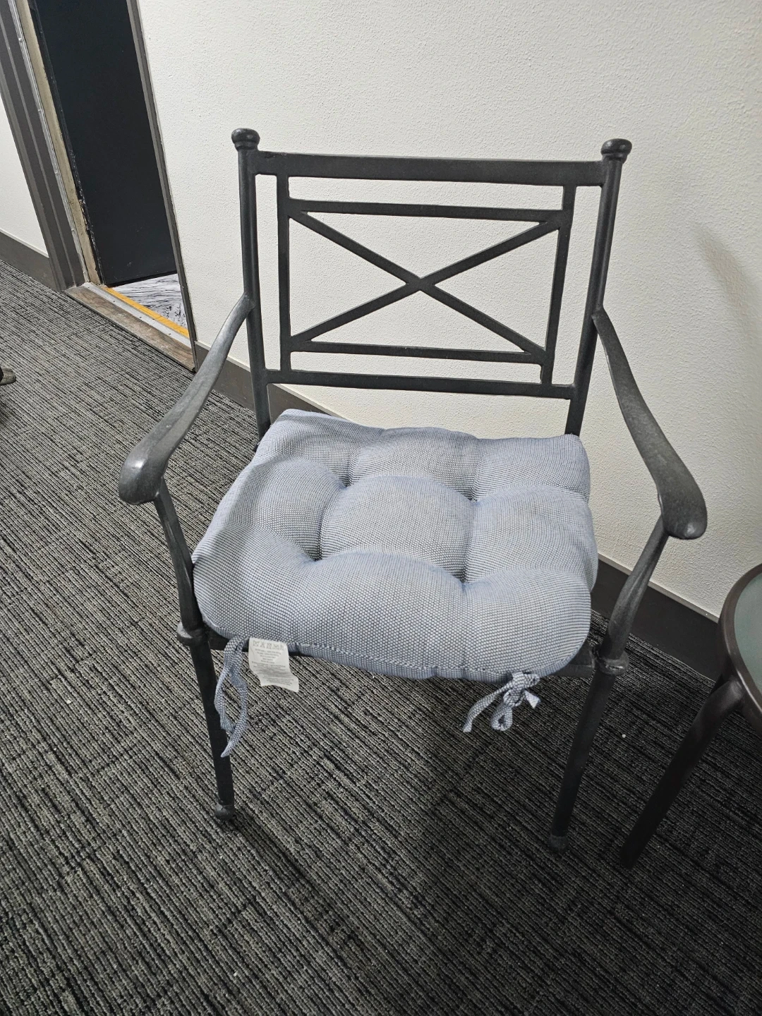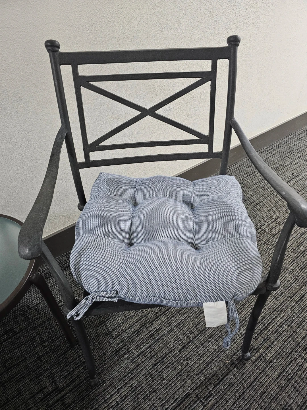 This used metal outdoor bistro set includes two chairs and a small table, perfect for a cozy patio or balcony! The set has a bronze-coloured finish and comes with comfortable blue seat cushions. Ideal for enjoying morning coffee or evening cocktails.