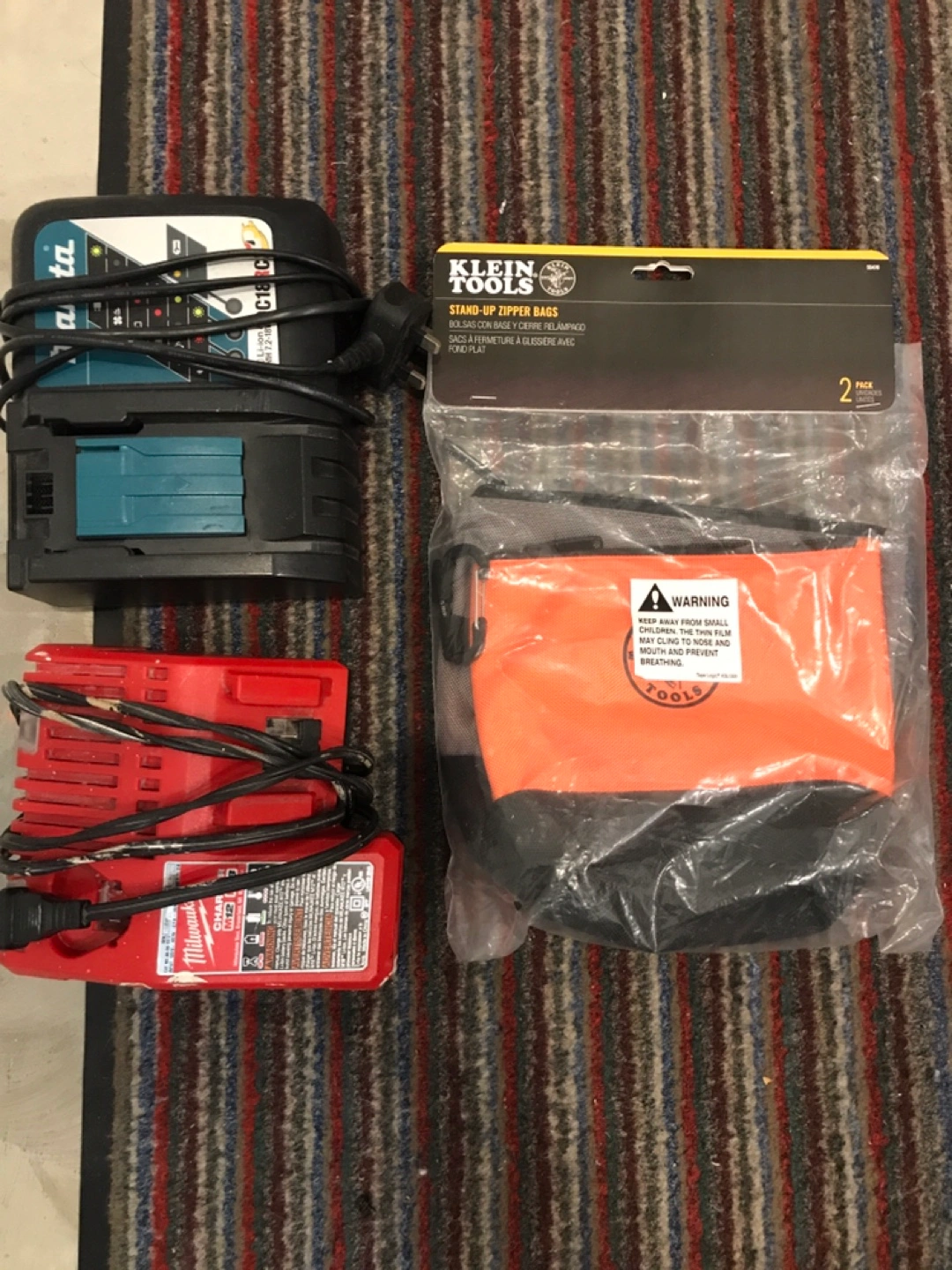 Selling a Makita & Milwaukee charger and a pack of Klein Tools stand-up zipper bags. The zipper bags are still in their original packaging.