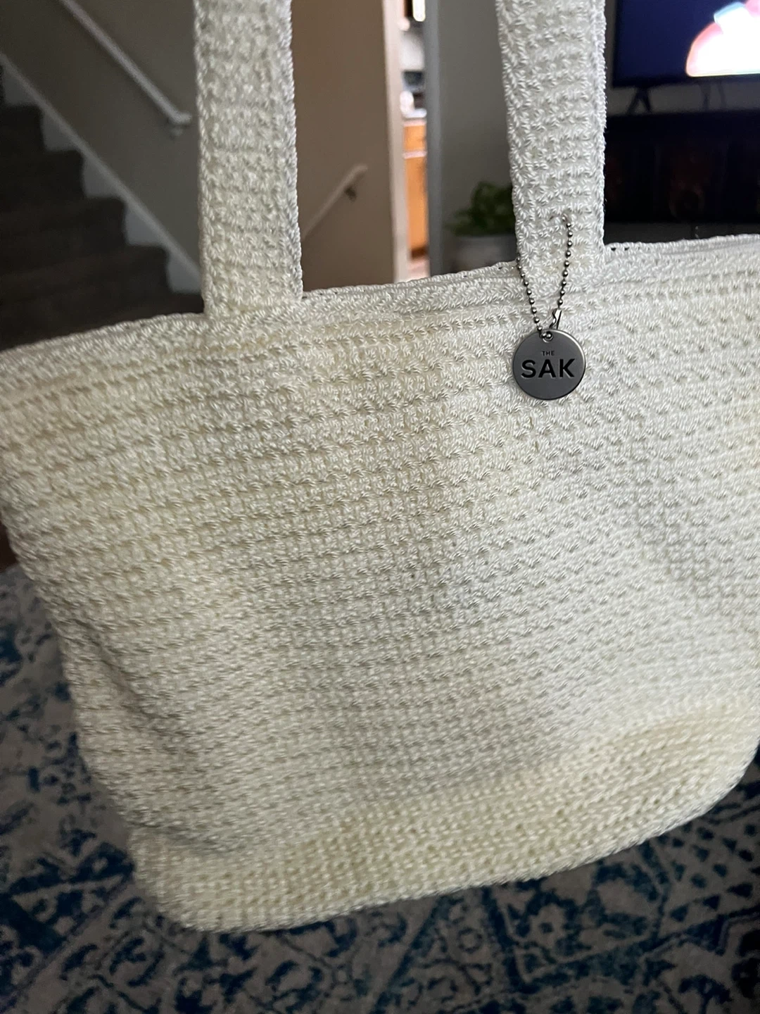 Spring is around the corner! This is “The SAK,” a white crocheted tote bag/purse. It features a zipper closure and a dangling charm with the SAK logo. The crochet material gives it a unique texture. It's a perfect for everyday use! 🌷