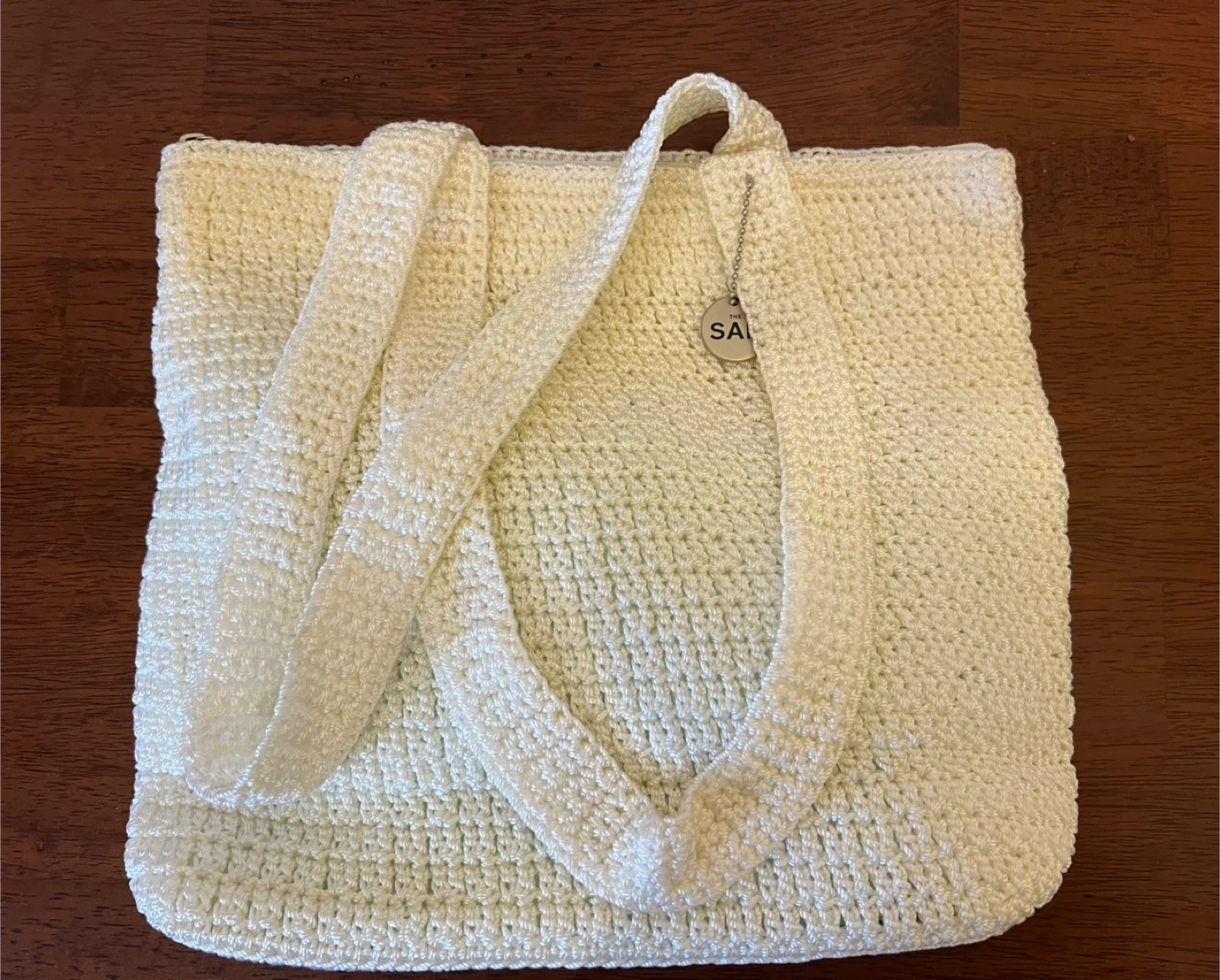 Spring is around the corner! This is “The SAK,” a white crocheted tote bag/purse. It features a zipper closure and a dangling charm with the SAK logo. The crochet material gives it a unique texture. It's a perfect for everyday use! 🌷