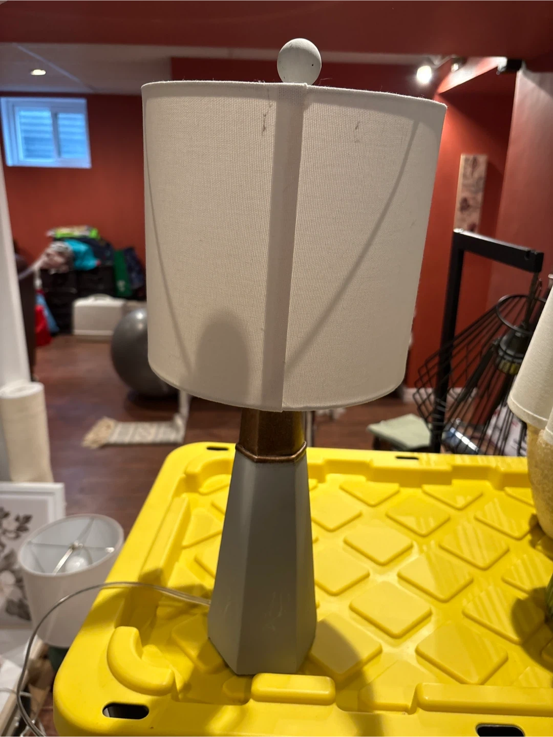 This table lamp features a gray tapered base with a white drum shade. It's ready to add a touch of light to any room. The base has a subtle geometric design. It uses a standard light bulb.