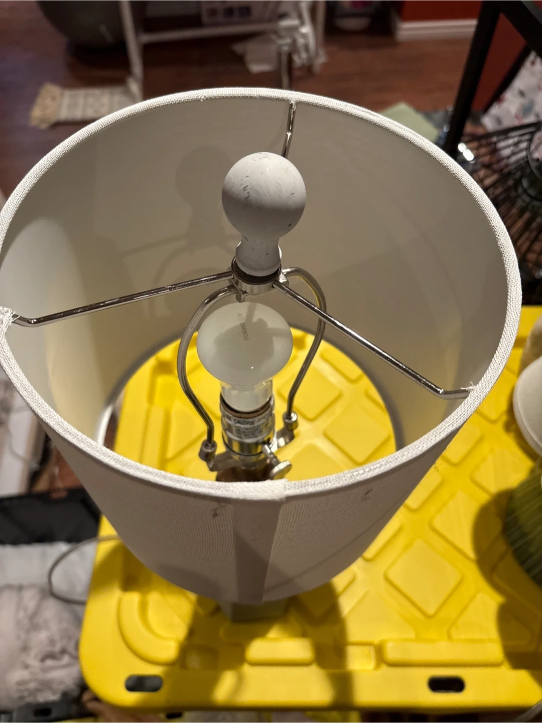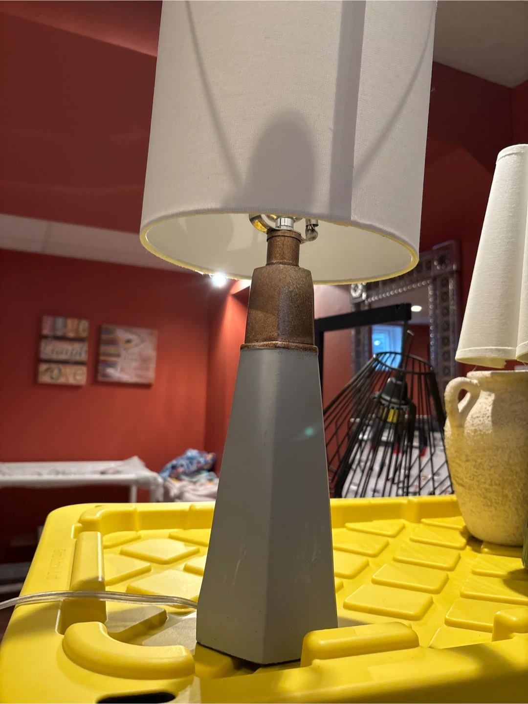 This table lamp features a gray tapered base with a white drum shade. It's ready to add a touch of light to any room. The base has a subtle geometric design. It uses a standard light bulb.