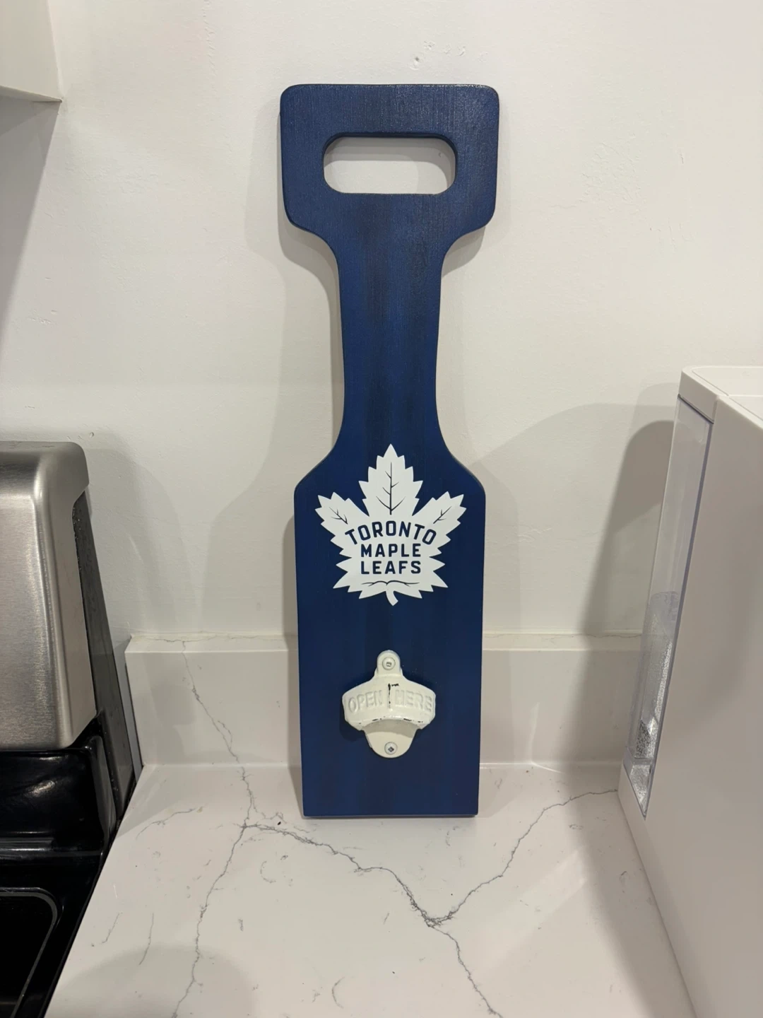This is a Toronto Maple Leafs-themed wooden bottle opener. It's designed for wall mounting and features the team's logo. Never used.