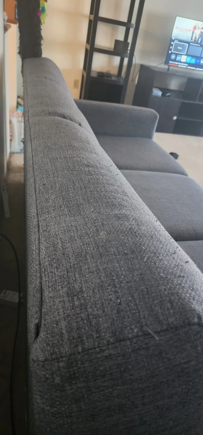 A grey sofa with three cushions. Upholstered in a textured fabric. Some pilling is visible on the arms and seat cushions.
