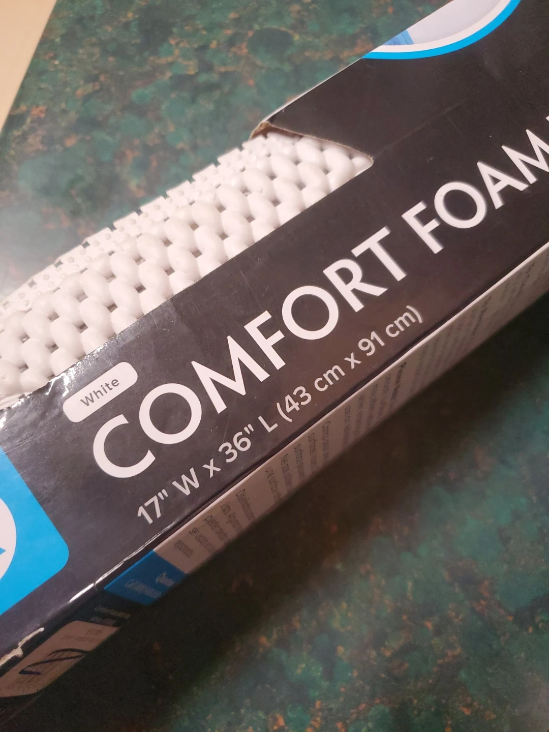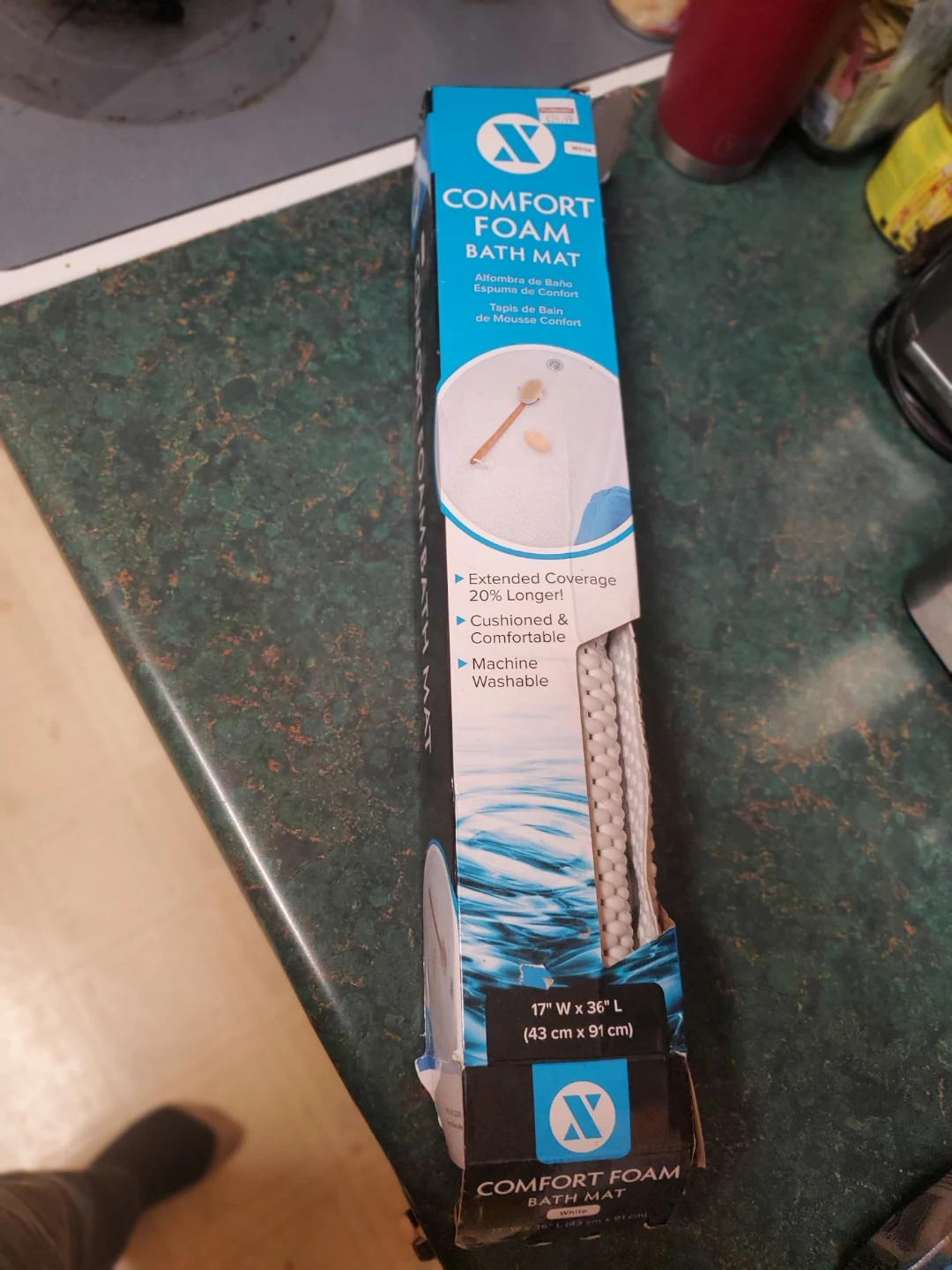 This is a white Comfort Foam bath mat, measuring 17" wide by 36" long. It's cushioned and comfortable, designed for extended coverage. The mat is machine washable for easy care. New. Box is Damaged but contents not. Cedar pick up.