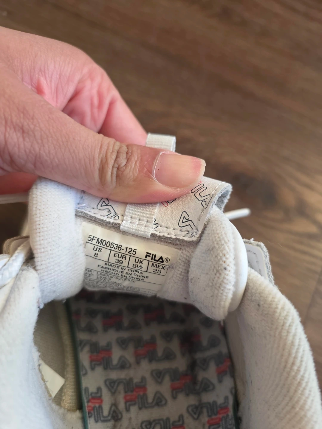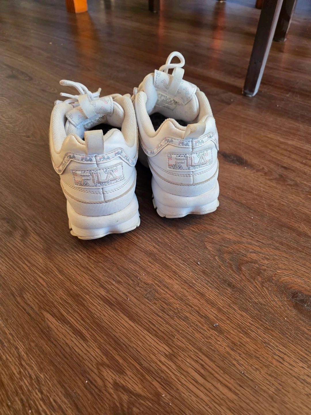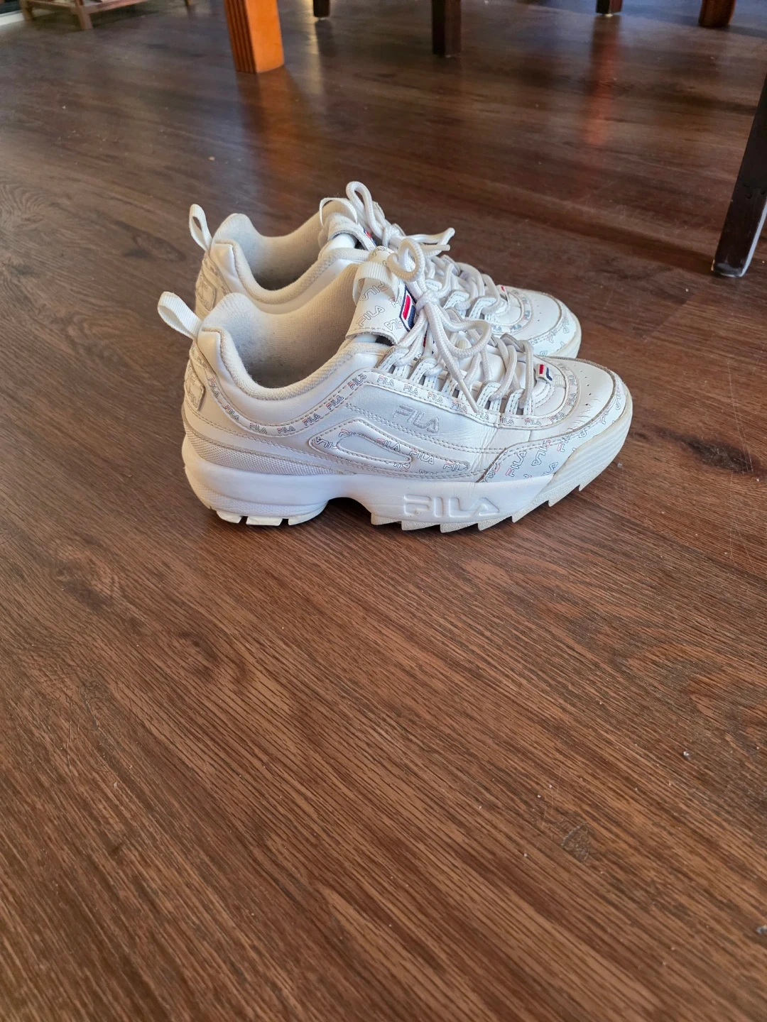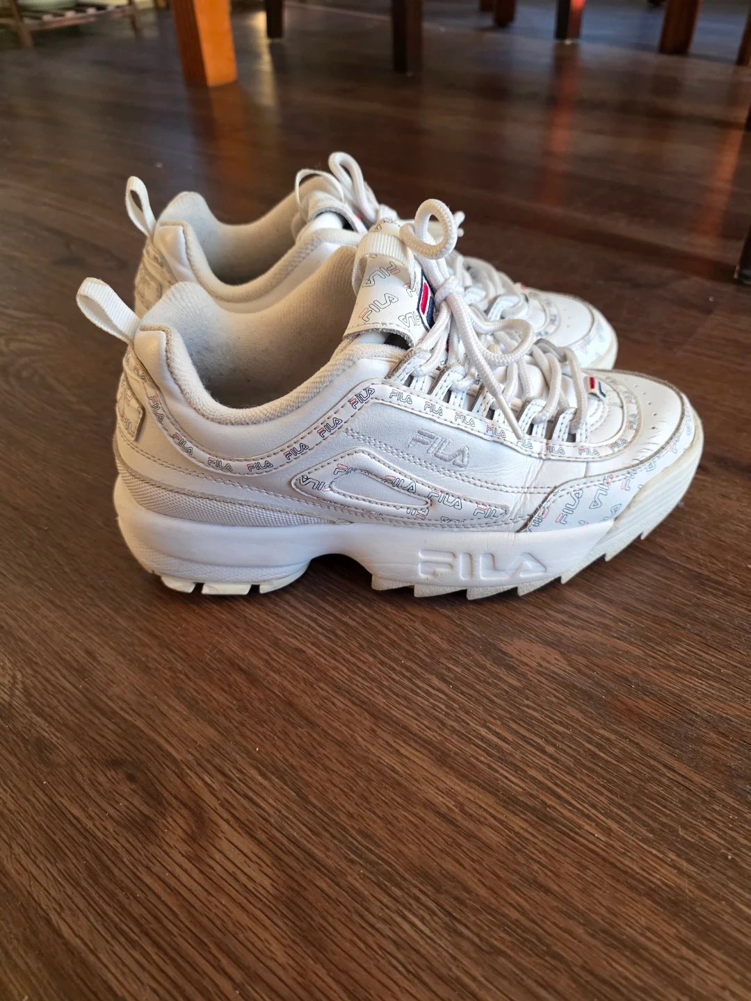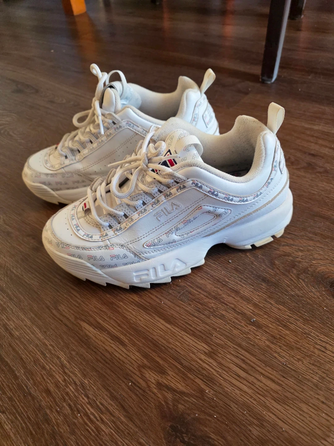 These white Fila Disruptor II sneakers feature all-over Fila logo detailing. Comfortable and stylish footwear. These are limited edition with the logo all over the shoe accents.