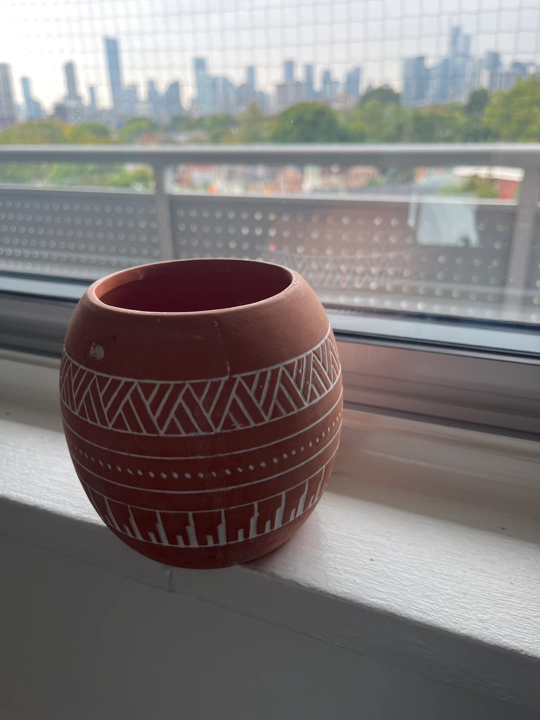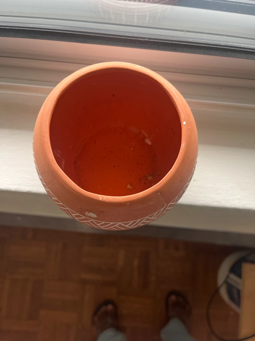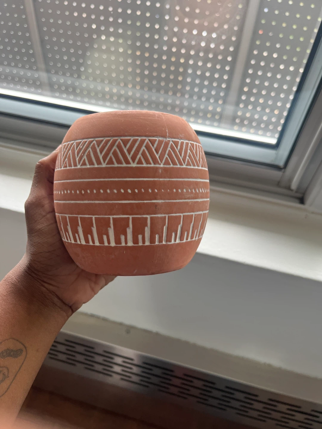 Selling a cute terracotta pot! It has a lovely white geometric design around it. Perfect for small plants or succulents to add a touch of warmth to your home