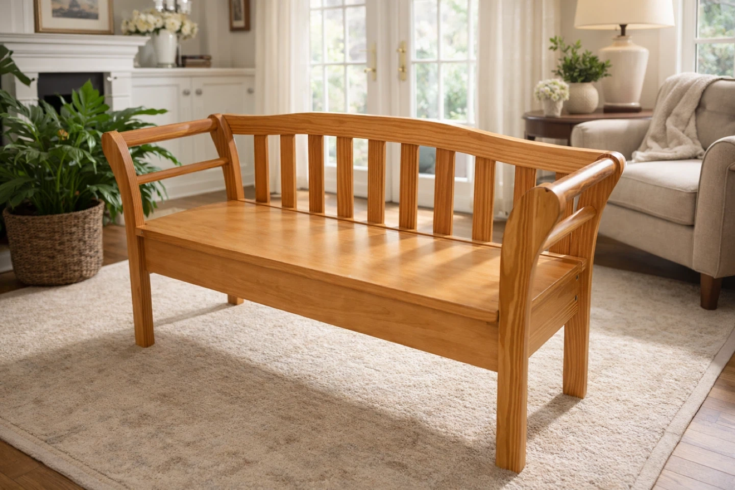 Pine Storage Bench with Lift-Top, Natural Light Wood, Seats Two