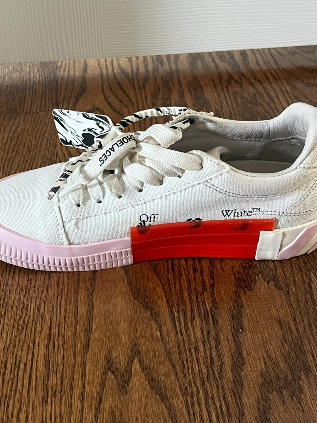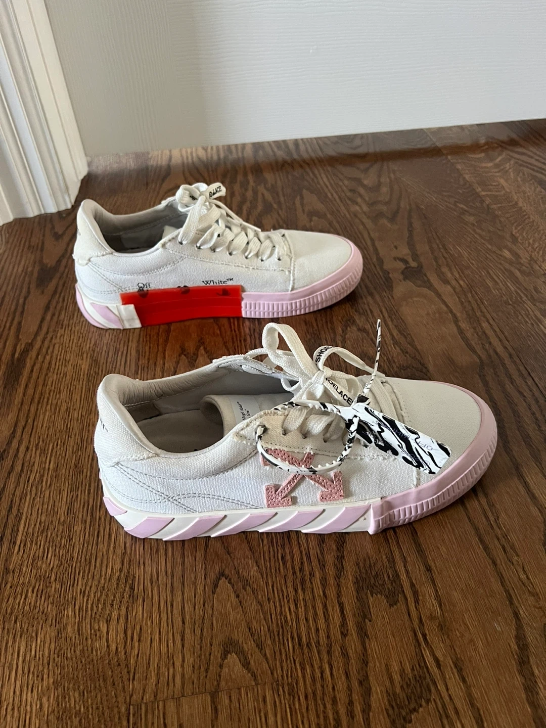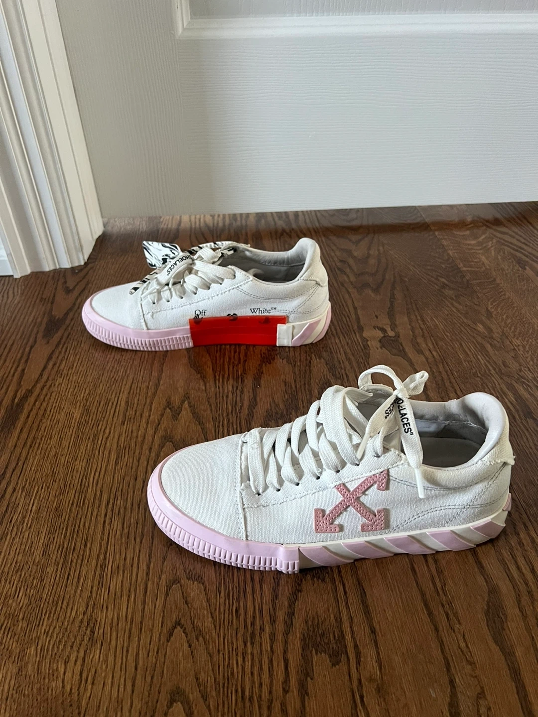 Selling a pair of Off-White c/o Virgil Abloh sneakers in a white and pink colourway! These stylish sneakers come with the dust bag and original box. They feature unique details like the "SHOELACES" text on the laces and the signature Off-White branding. Perfect for adding a touch of streetwear to your wardrobe!