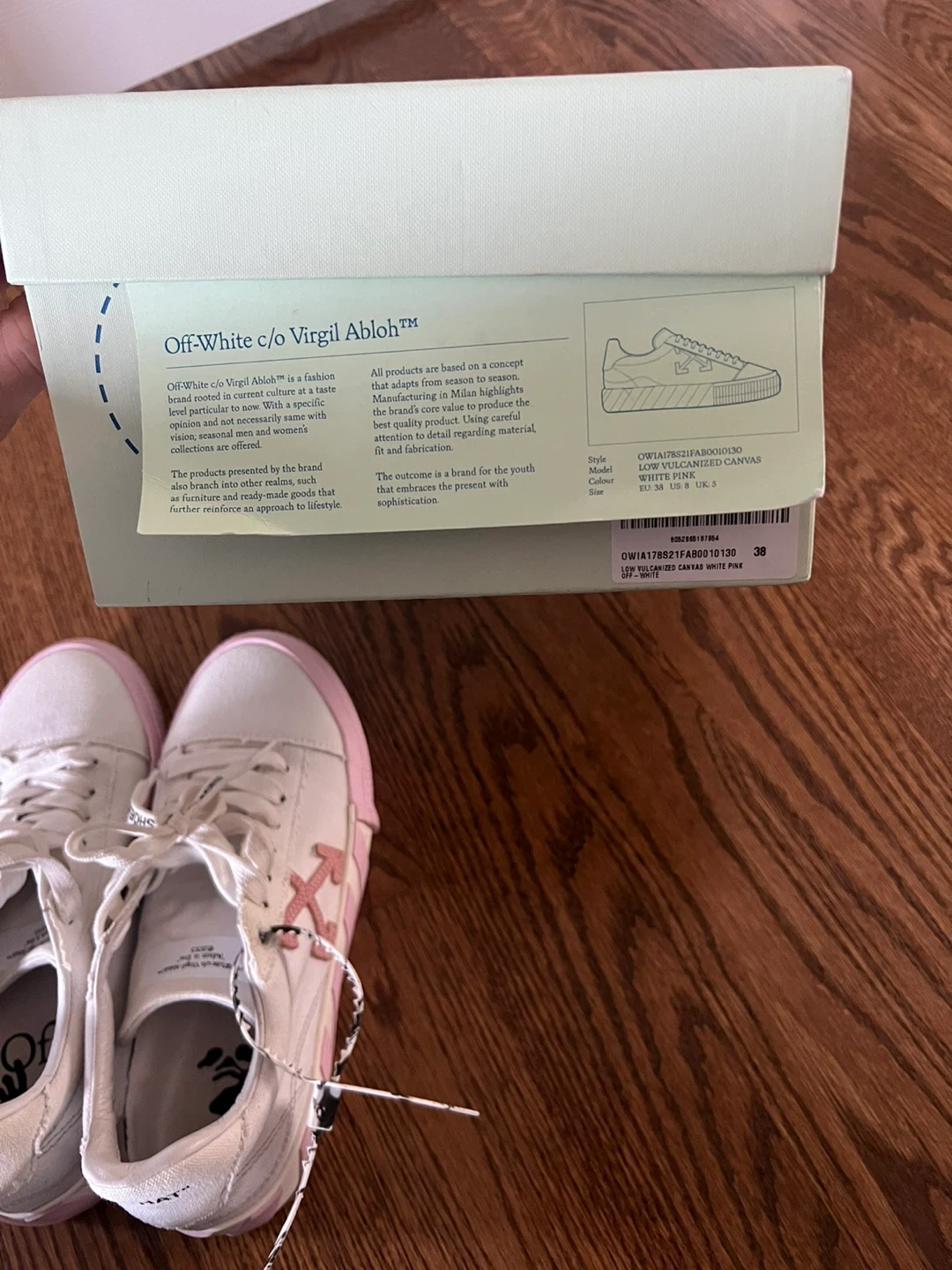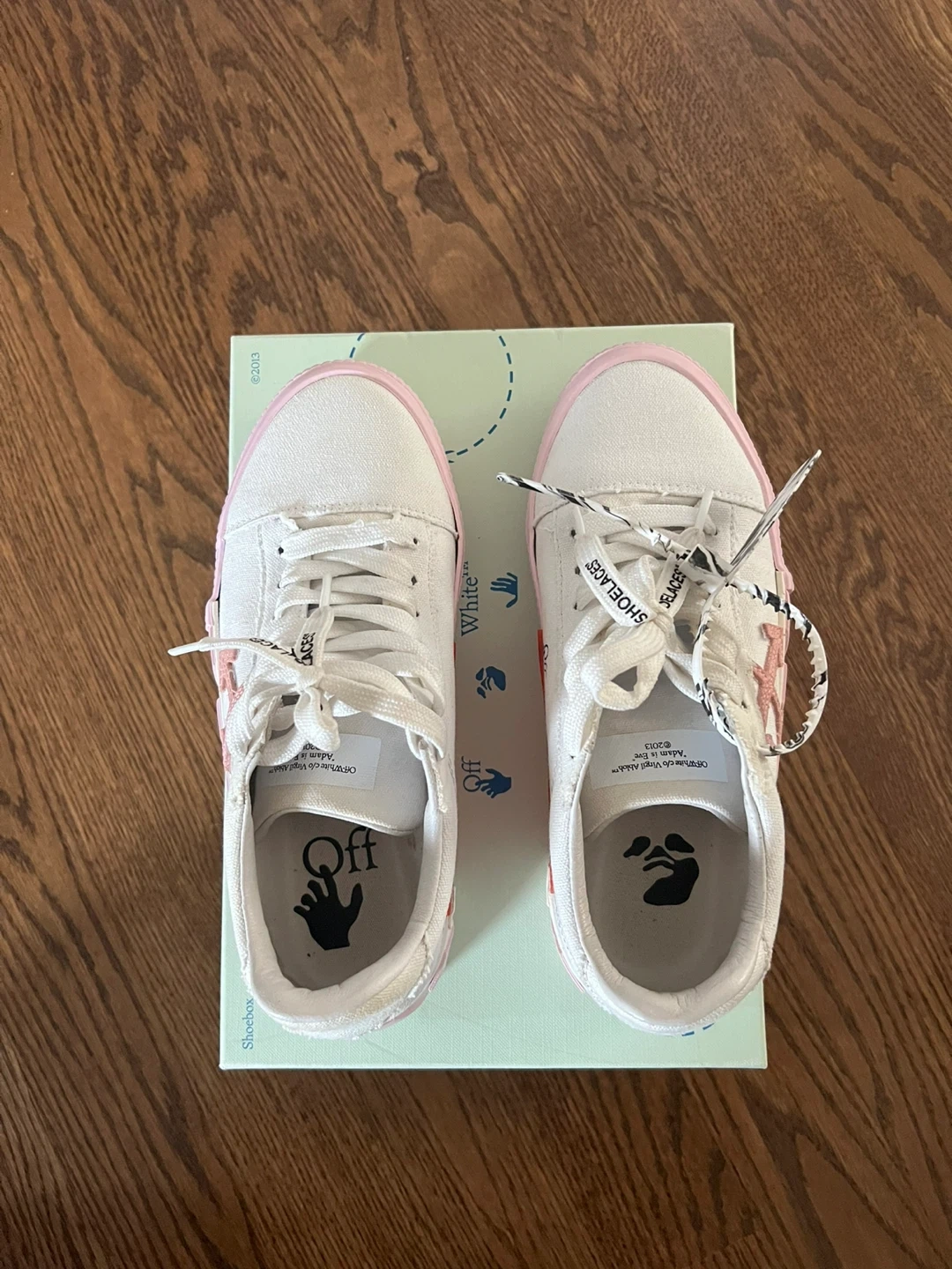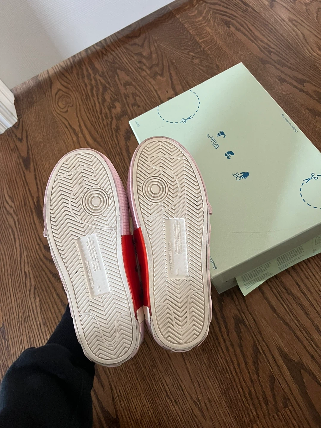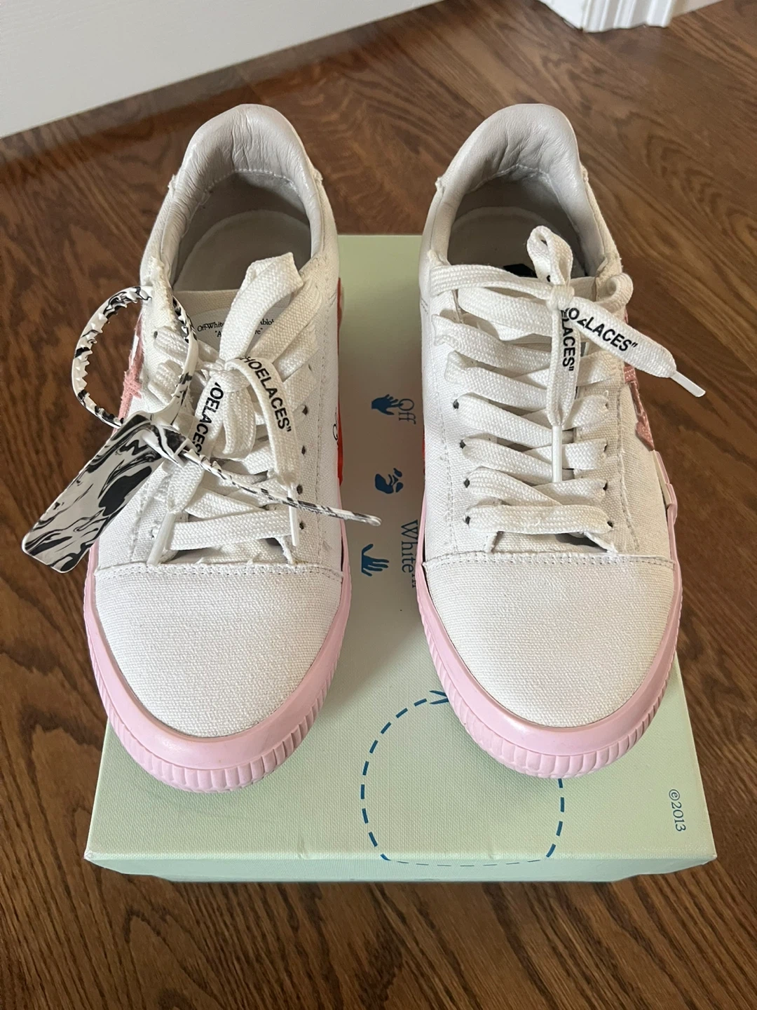 Selling a pair of Off-White c/o Virgil Abloh sneakers in a white and pink colourway! These stylish sneakers come with the dust bag and original box. They feature unique details like the "SHOELACES" text on the laces and the signature Off-White branding. Perfect for adding a touch of streetwear to your wardrobe!