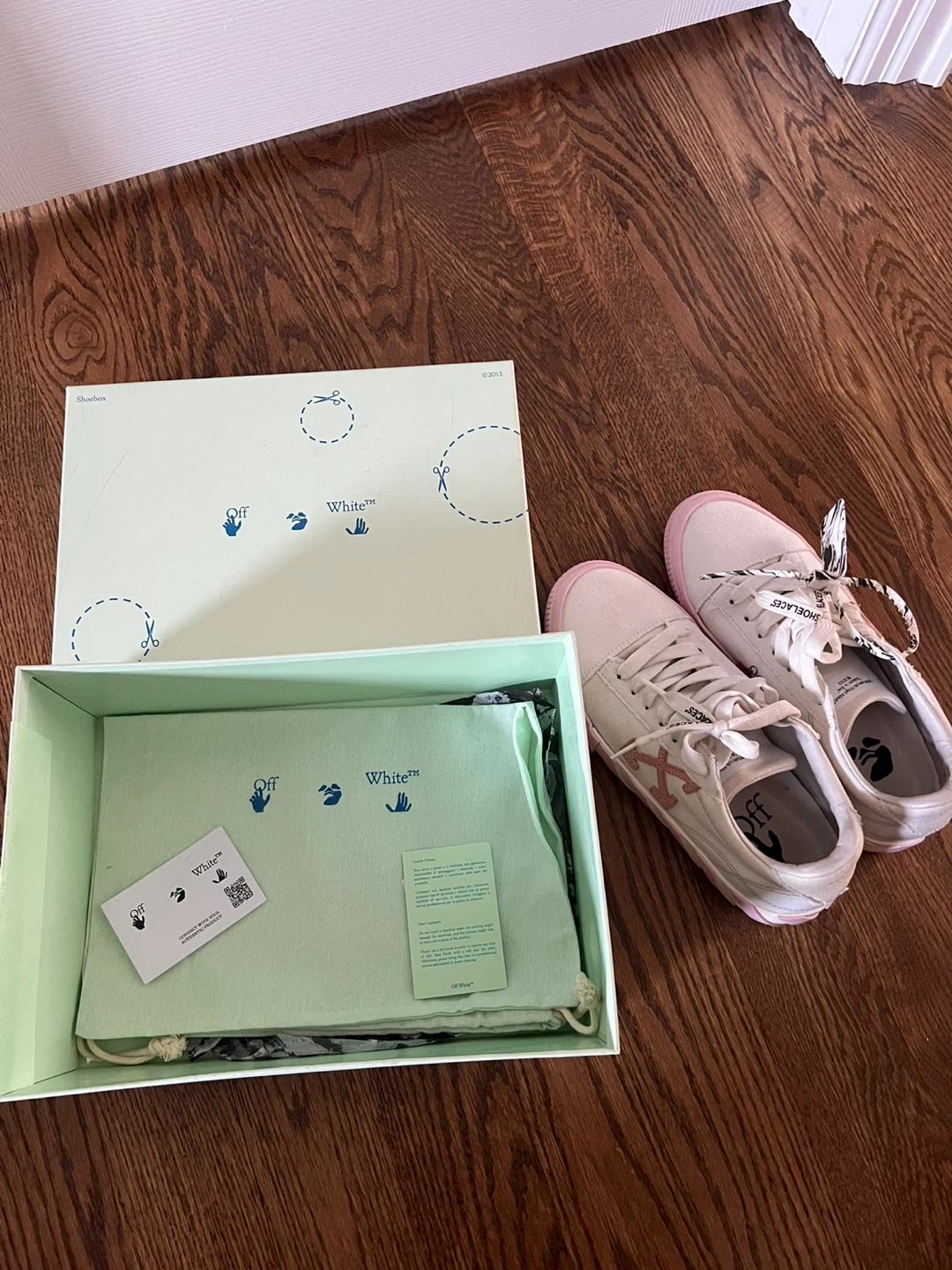 Selling a pair of Off-White c/o Virgil Abloh sneakers in a white and pink colourway! These stylish sneakers come with the dust bag and original box. They feature unique details like the "SHOELACES" text on the laces and the signature Off-White branding. Perfect for adding a touch of streetwear to your wardrobe!