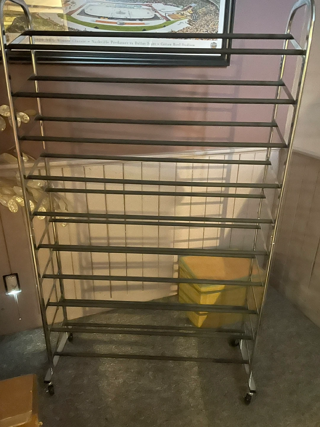 This 10-tier shoe rack offers ample storage for your footwear. It's made of metal with a chrome finish and features wheels for easy mobility. This rack is great for organizing shoes in a closet or entryway. Or in basement to put away seasonal shoes. Holds up to 50 pairs.