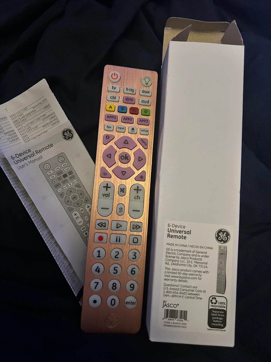 This is a GE 6-device universal remote control in a rose gold finish. It includes the user manual, codes list, and original box. Great for managing multiple electronics with one remote!