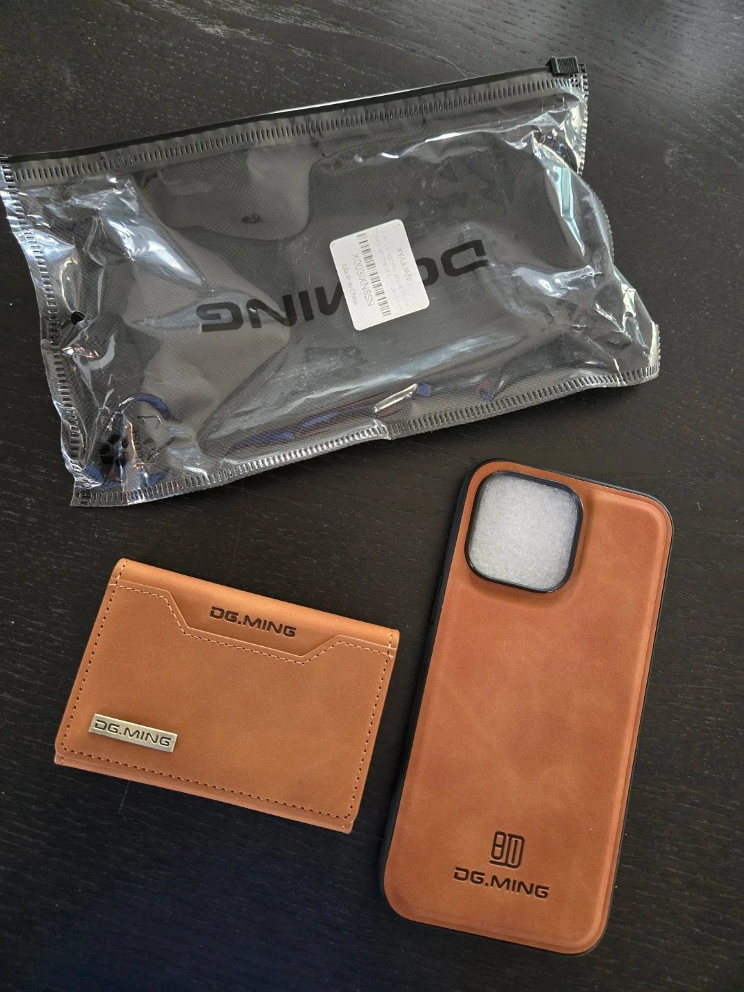 This is a DG.MING wallet case for iPhone 14 Pro. It's a 2-in-1 magnetic detachable card holder with RFID blocking and 7 card slots. The case also includes a kickstand and is made of PU leather. It's compatible with MagSafe and has a shockproof TPU design.