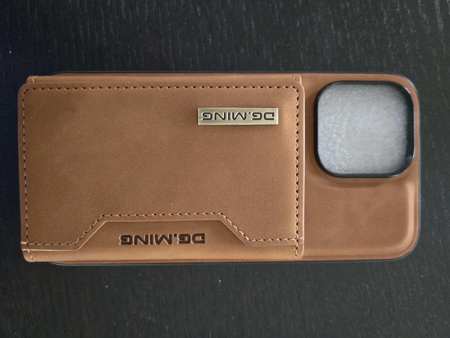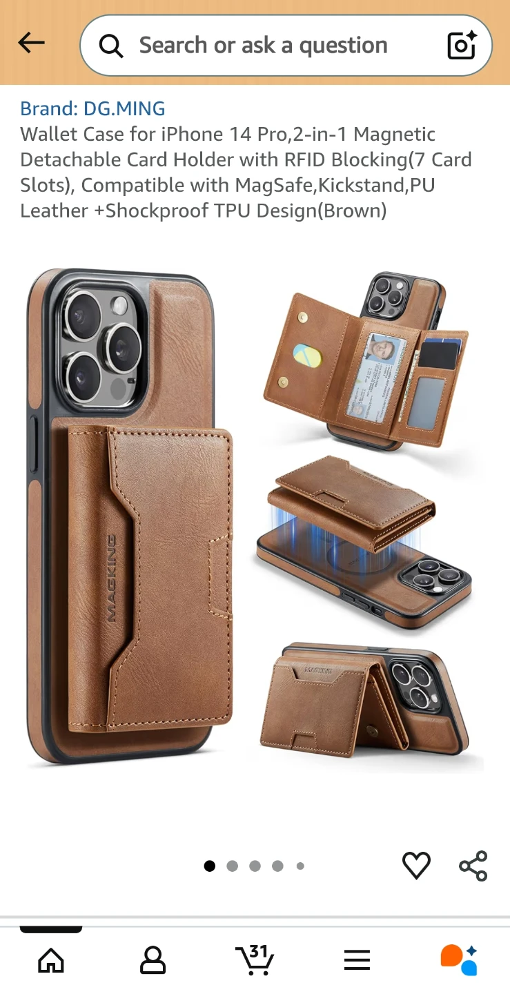 This is a DG.MING wallet case for iPhone 14 Pro. It's a 2-in-1 magnetic detachable card holder with RFID blocking and 7 card slots. The case also includes a kickstand and is made of PU leather. It's compatible with MagSafe and has a shockproof TPU design.