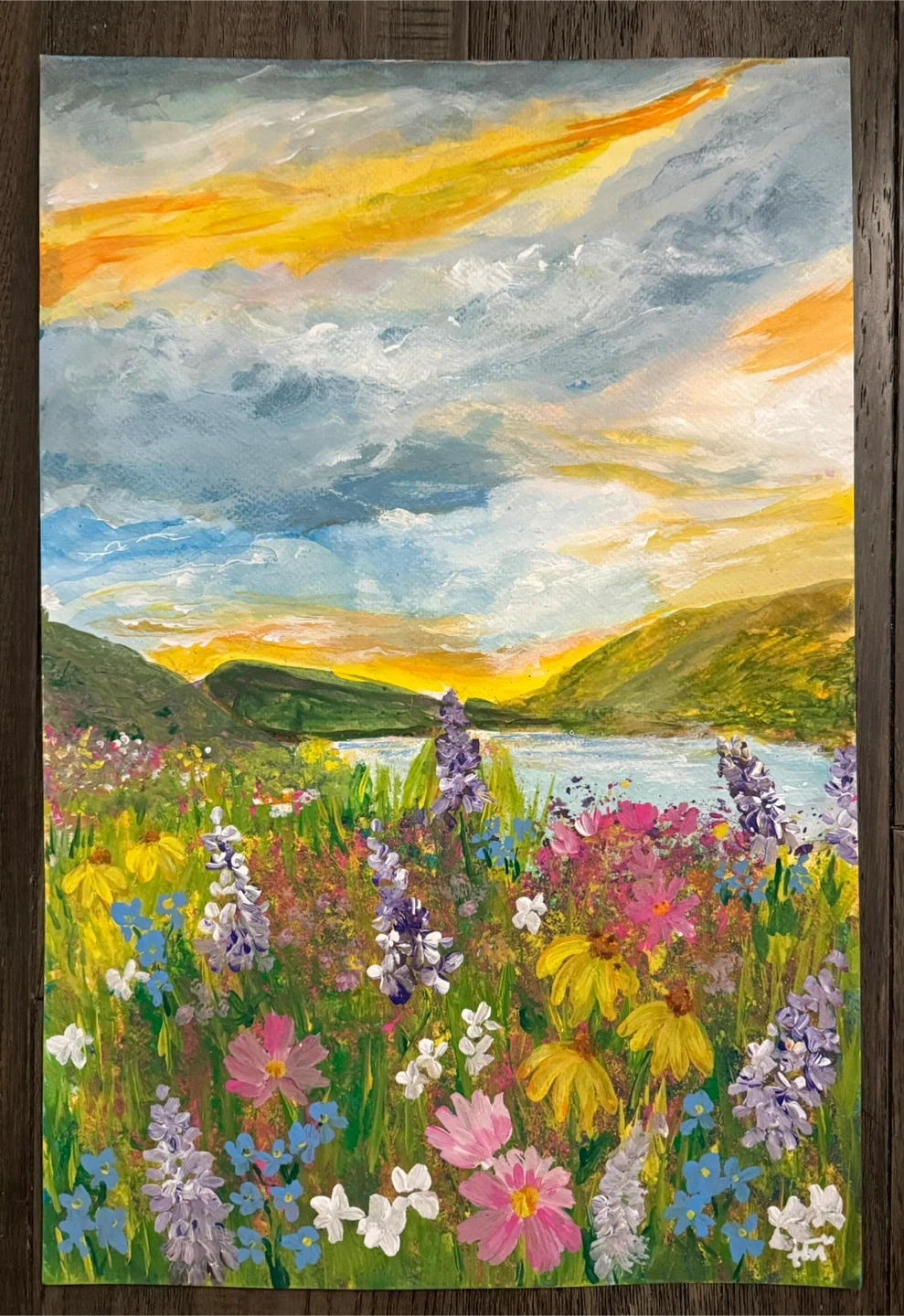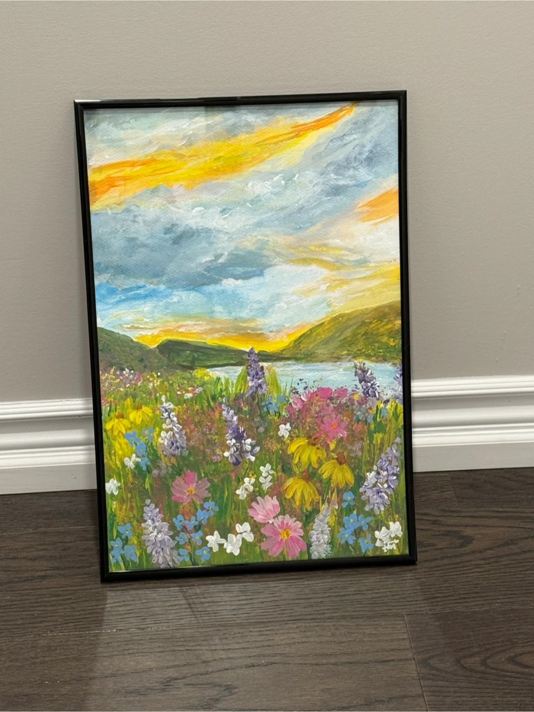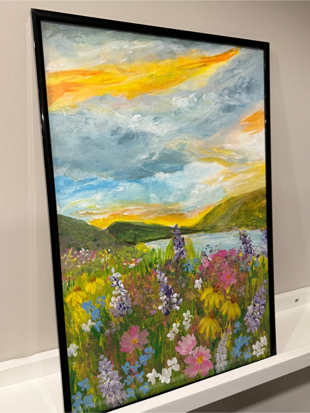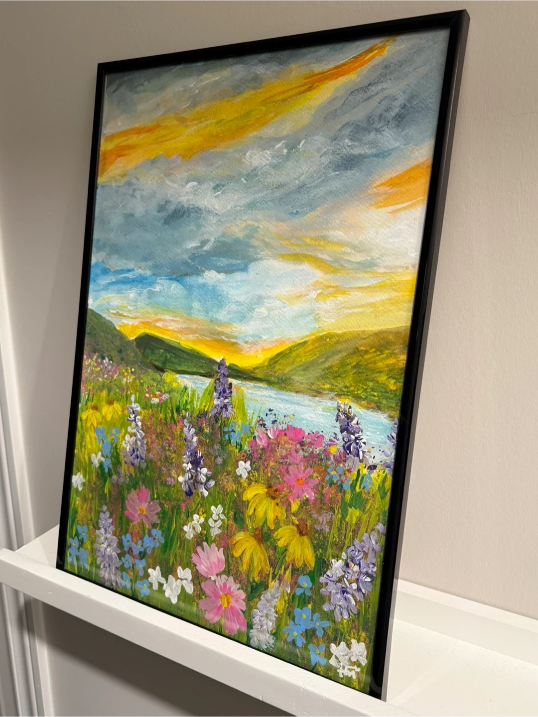 Vibrant original acrylic painting on 12”X18” watercolour paper depicting a colourful wildflower field at sunset with a lake and rolling hills. It's framed in a sleek black frame. This is an original one of a kind hand painted with love. I am so ready for spring! I call this The Flowers Grow In The Valley. It’s a lyrical excerpt from the song Flowers by Samantha Ebert. It carries with it the message of hope for better days. Spring will come, flowers will bloom…