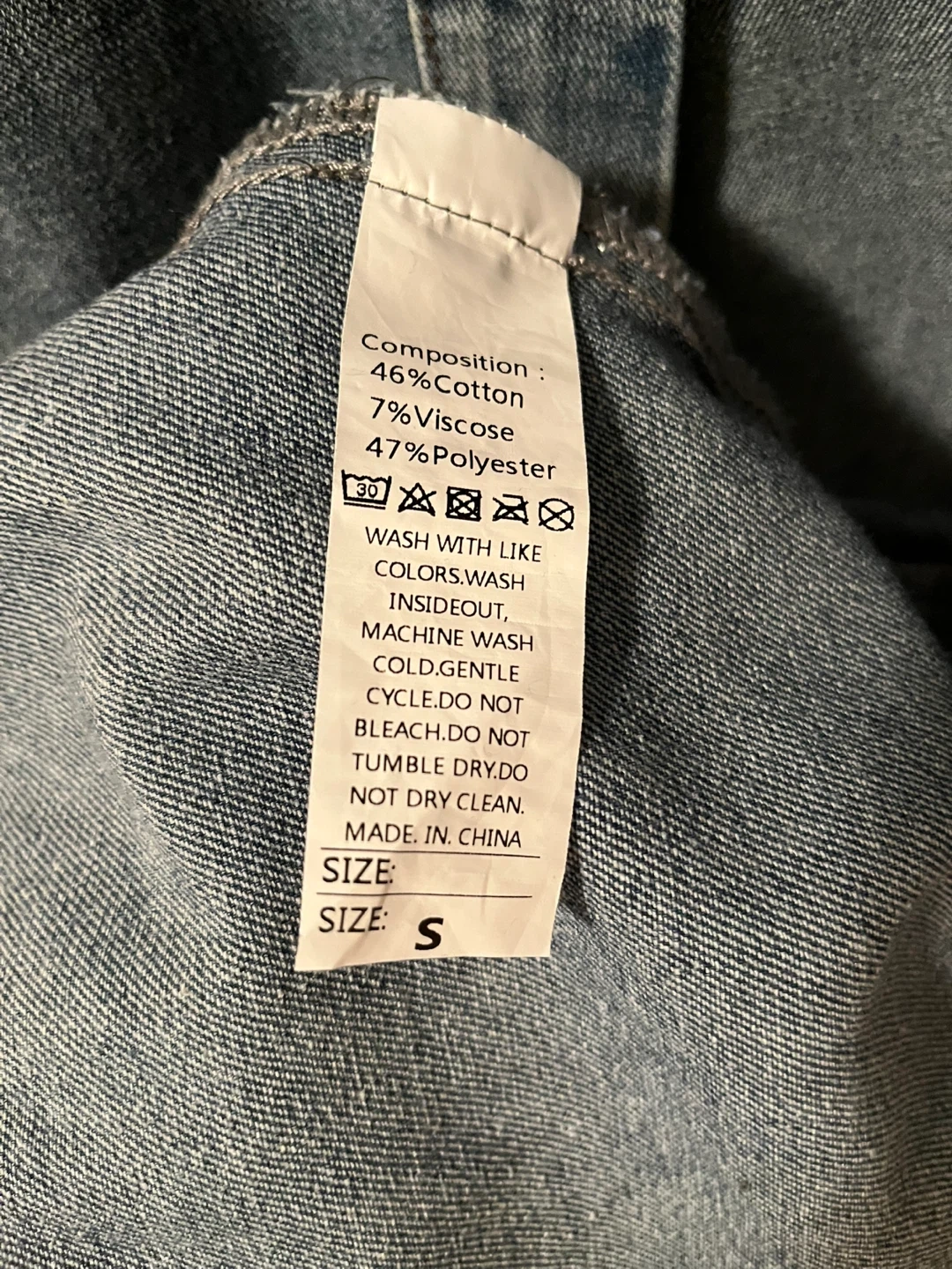This is a long denim jacket. It's made of 46% cotton, 7% viscose, and 47% polyester. Machine wash cold, gentle cycle. Do not bleach or tumble dry.