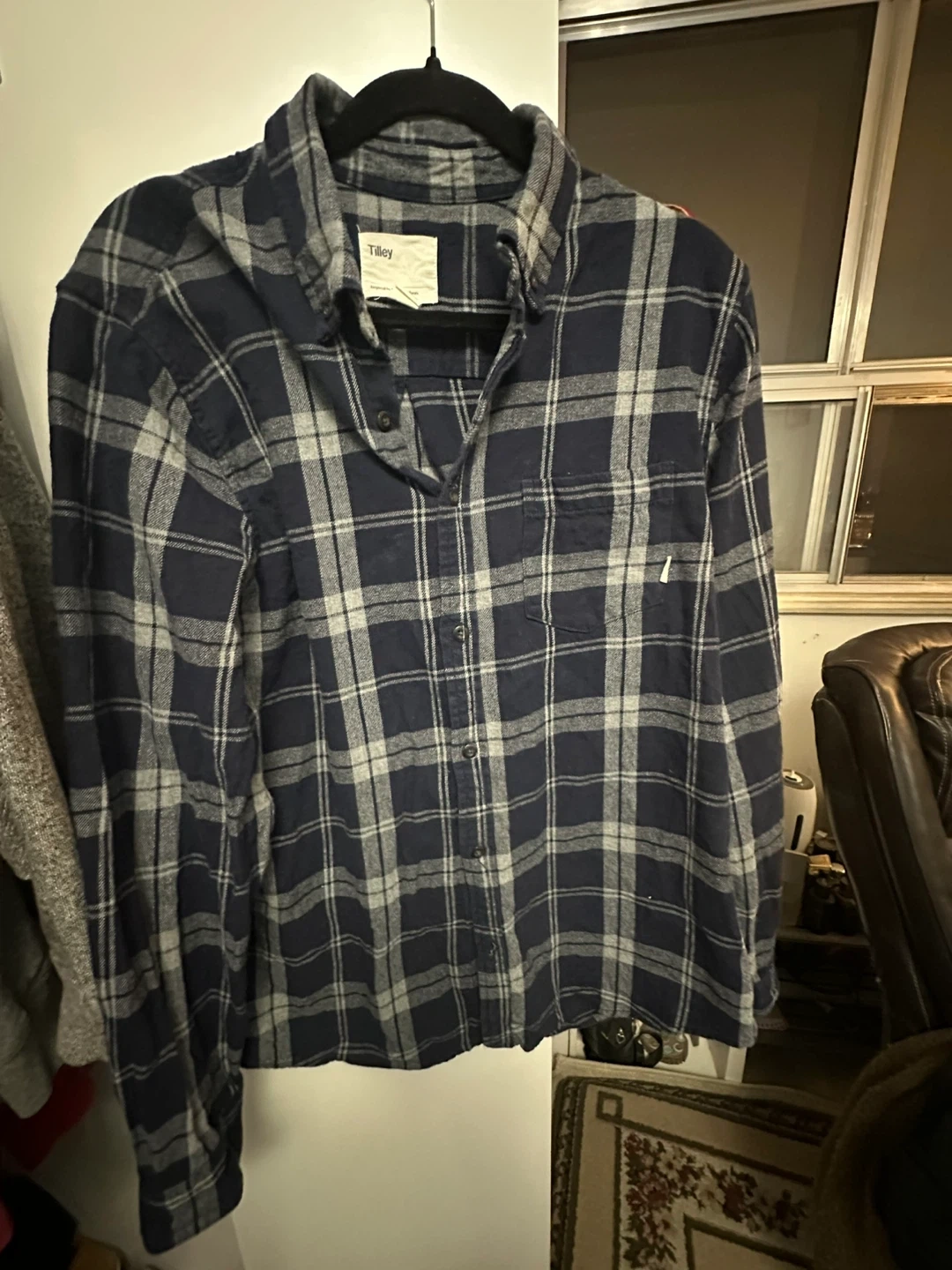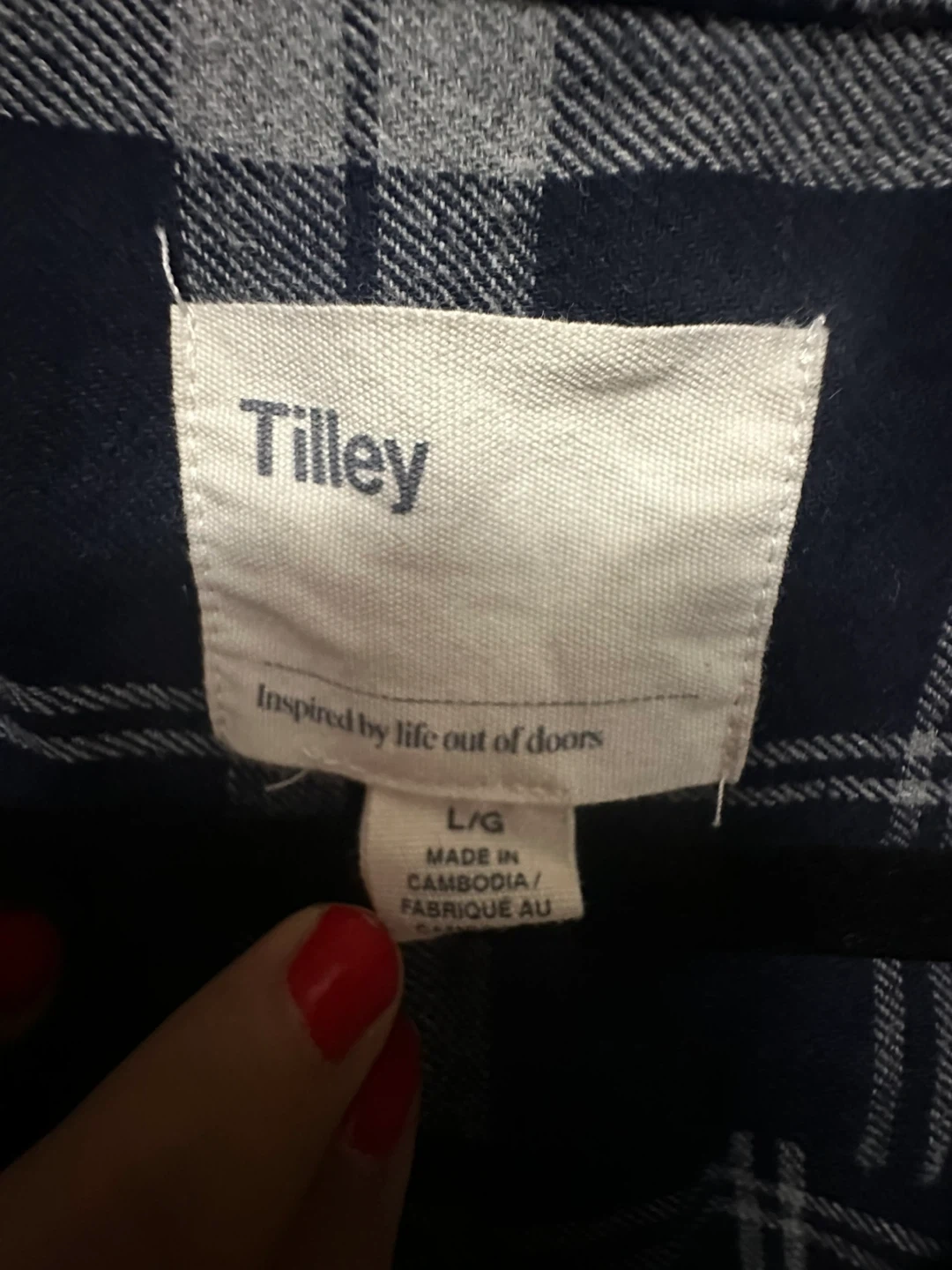 This Tilley plaid long sleeve shirt is size L/G. It's inspired by life out of doors and made in Cambodia. The shirt is a classic flannel style with a button-up front. It's comfortable for casual wear.