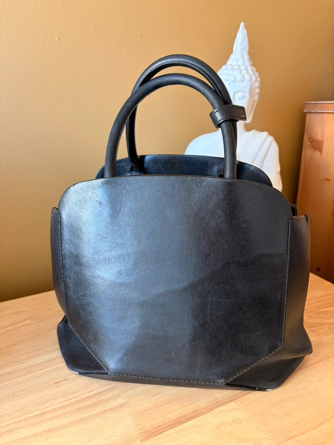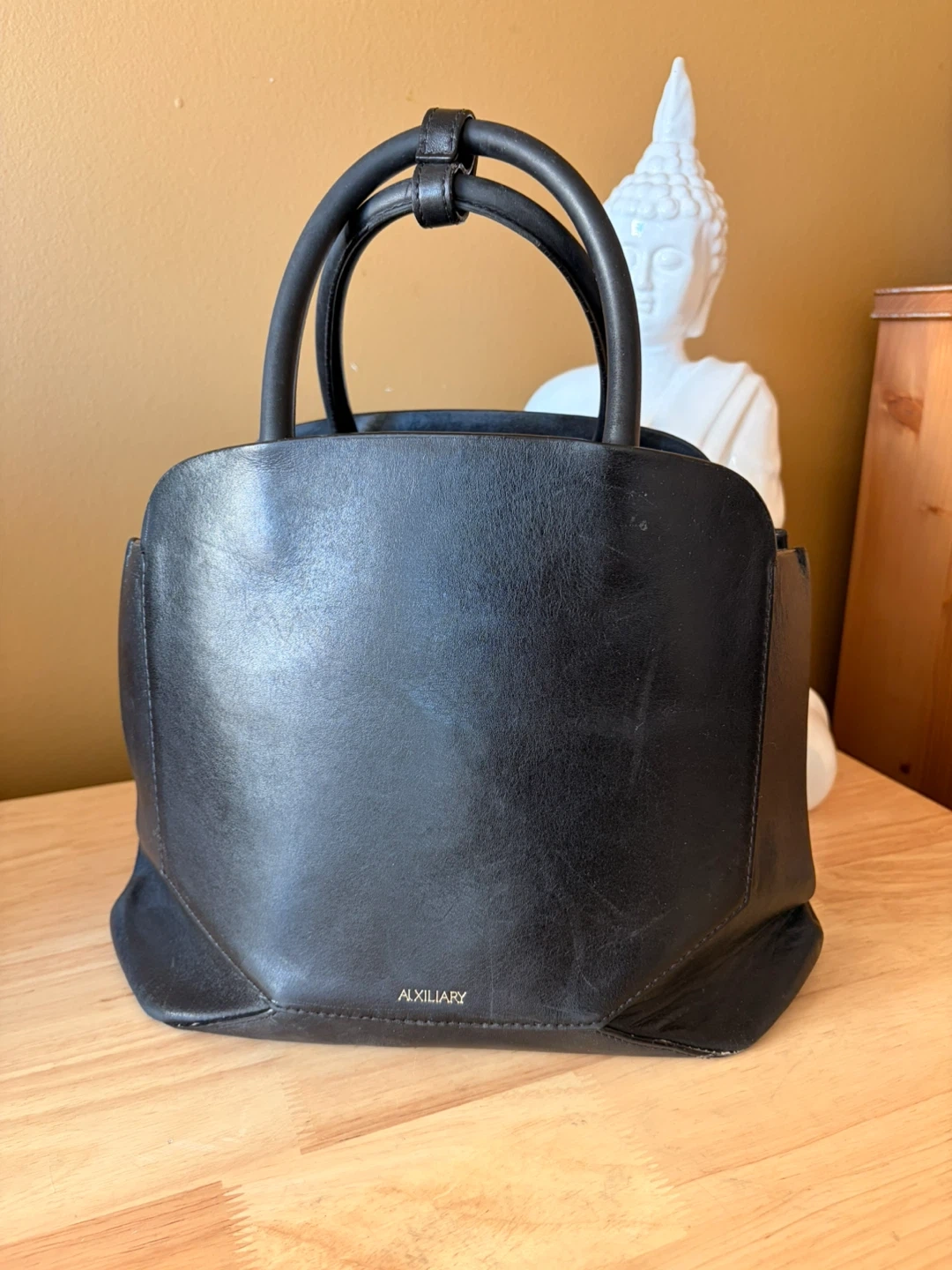 This is a black leather handbag from Auxiliary. It features a structured design and top handles. Made with genuine leather.