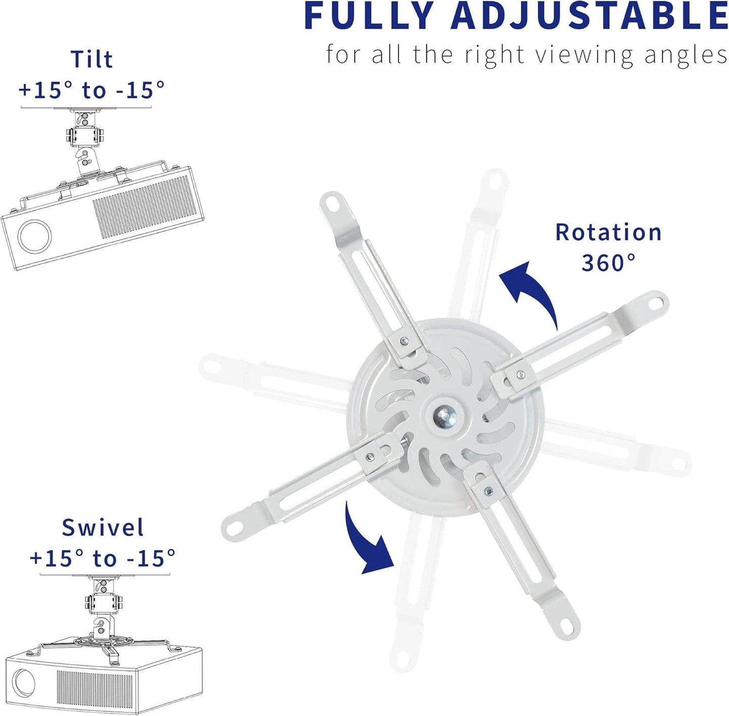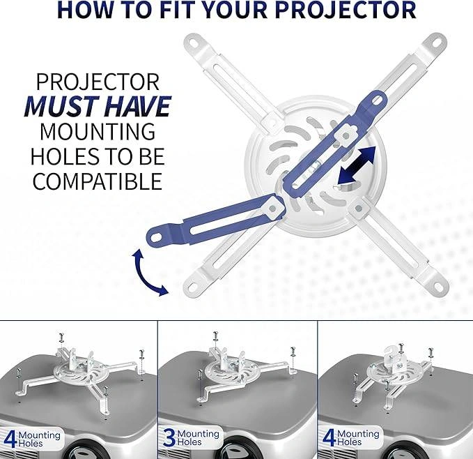 Selling a fully adjustable projector ceiling mount! It's designed to fit projectors with either 3 or 4 mounting holes. It can tilt +15° to -15°, swivel +15° to -15°, and rotate 360° for the perfect viewing angle. The longest distance between mounting holes must be 5.25" to 12.5". It can be mounted 6" from the ceiling and has a weight capacity of up to 30 lbs